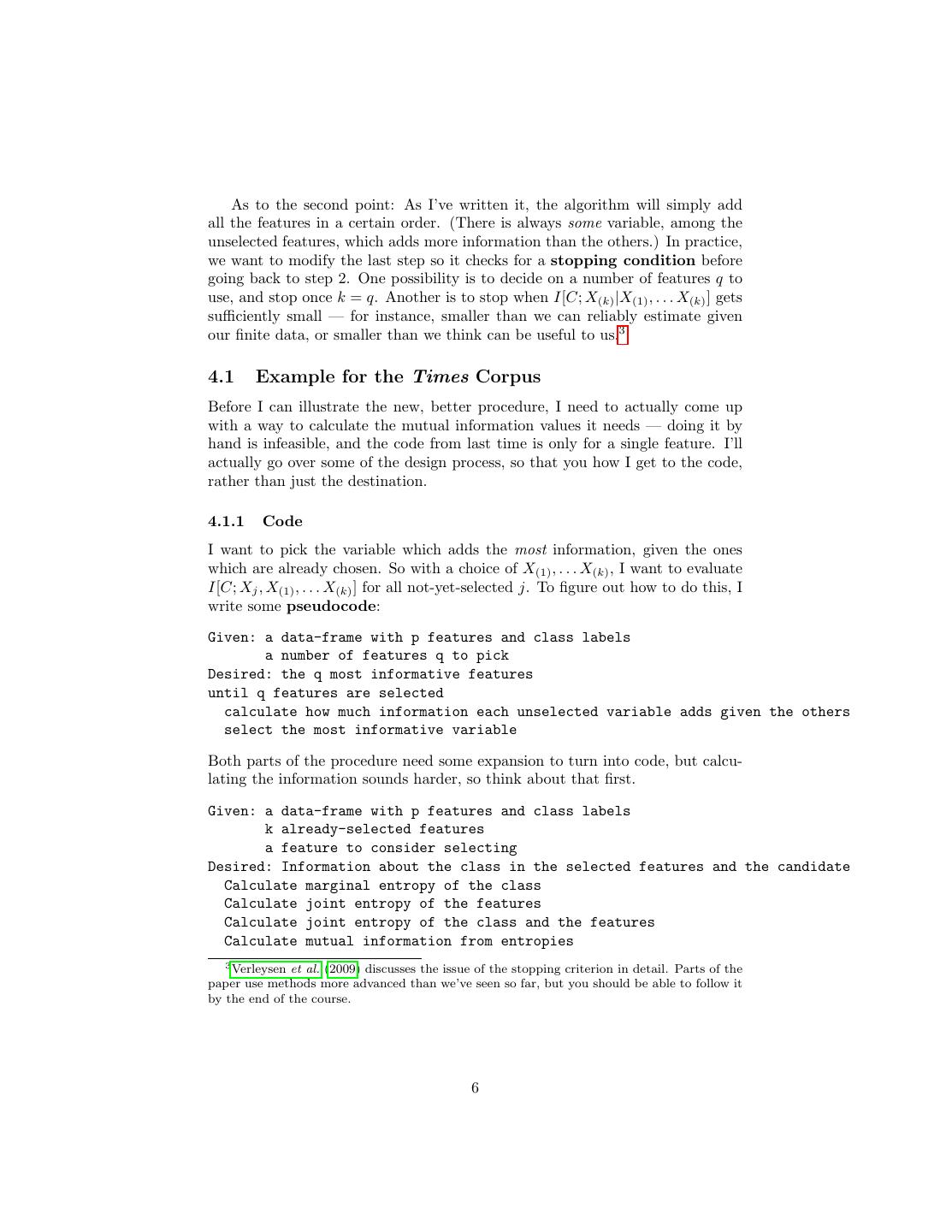6 . As to the second point: As I’ve written it, the algorithm will simply add all the features in a certain order. (There is always some variable, among the unselected features, which adds more information than the others.) In practice, we want to modify the last step so it checks for a stopping condition before going back to step 2. One possibility is to decide on a number of features q to use, and stop once k = q. Another is to stop when I[C; X(k) |X(1) , . . . X(k) ] gets sufficiently small — for instance, smaller than we can reliably estimate given our finite data, or smaller than we think can be useful to us.3 4.1 Example for the Times Corpus Before I can illustrate the new, better procedure, I need to actually come up with a way to calculate the mutual information values it needs — doing it by hand is infeasible, and the code from last time is only for a single feature. I’ll actually go over some of the design process, so that you how I get to the code, rather than just the destination. 4.1.1 Code I want to pick the variable which adds the most information, given the ones which are already chosen. So with a choice of X(1) , . . . X(k) , I want to evaluate I[C; Xj , X(1) , . . . X(k) ] for all not-yet-selected j. To figure out how to do this, I write some pseudocode: Given: a data-frame with p features and class labels a number of features q to pick Desired: the q most informative features until q features are selected calculate how much information each unselected variable adds given the others select the most informative variable Both parts of the procedure need some expansion to turn into code, but calcu- lating the information sounds harder, so think about that first. Given: a data-frame with p features and class labels k already-selected features a feature to consider selecting Desired: Information about the class in the selected features and the candidate Calculate marginal entropy of the class Calculate joint entropy of the features Calculate joint entropy of the class and the features Calculate mutual information from entropies 3 Verleysen et al. (2009) discusses the issue of the stopping criterion in detail. Parts of the paper use methods more advanced than we’ve seen so far, but you should be able to follow it by the end of the course. 6
