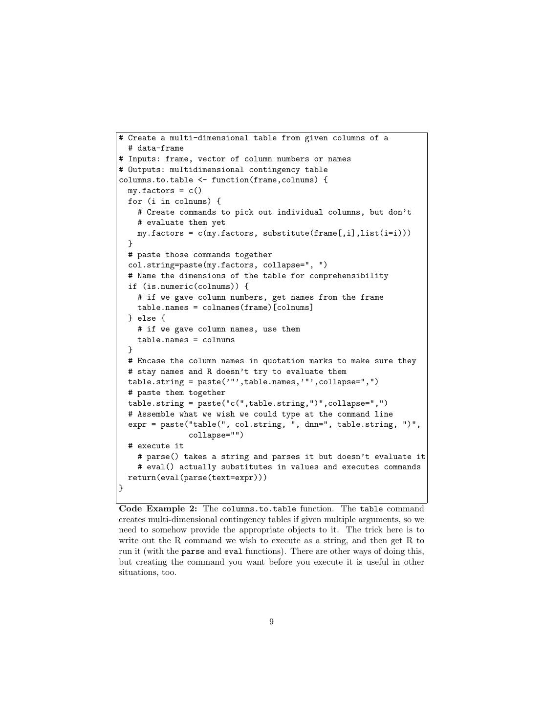 9 .# Create a multi-dimensional table from given columns of a # data-frame # Inputs: frame, vector of column numbers or names # Outputs: multidimensional contingency table columns.to.table <- function(frame,colnums) { my.factors = c() for (i in colnums) { # Create commands to pick out individual columns, but don’t # evaluate them yet my.factors = c(my.factors, substitute(frame[,i],list(i=i))) } # paste those commands together col.string=paste(my.factors, collapse=", ") # Name the dimensions of the table for comprehensibility if (is.numeric(colnums)) { # if we gave column numbers, get names from the frame table.names = colnames(frame)[colnums] } else { # if we gave column names, use them table.names = colnums } # Encase the column names in quotation marks to make sure they # stay names and R doesn’t try to evaluate them table.string = paste(’"’,table.names,’"’,collapse=",") # paste them together table.string = paste("c(",table.string,")",collapse=",") # Assemble what we wish we could type at the command line expr = paste("table(", col.string, ", dnn=", table.string, ")", collapse="") # execute it # parse() takes a string and parses it but doesn’t evaluate it # eval() actually substitutes in values and executes commands return(eval(parse(text=expr))) } Code Example 2: The columns.to.table function. The table command creates multi-dimensional contingency tables if given multiple arguments, so we need to somehow provide the appropriate objects to it. The trick here is to write out the R command we wish to execute as a string, and then get R to run it (with the parse and eval functions). There are other ways of doing this, but creating the command you want before you execute it is useful in other situations, too. 9