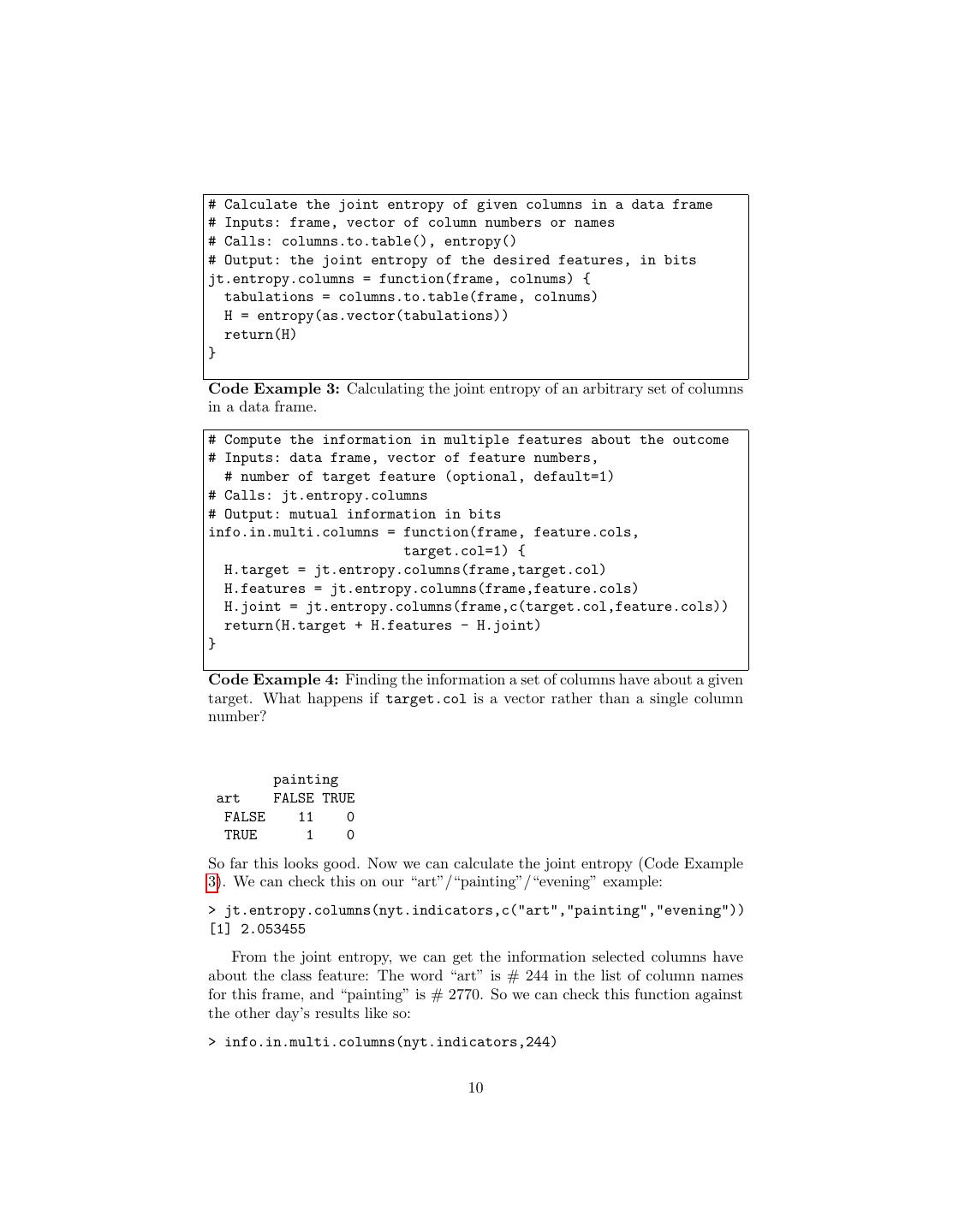 10 .# Calculate the joint entropy of given columns in a data frame # Inputs: frame, vector of column numbers or names # Calls: columns.to.table(), entropy() # Output: the joint entropy of the desired features, in bits jt.entropy.columns = function(frame, colnums) { tabulations = columns.to.table(frame, colnums) H = entropy(as.vector(tabulations)) return(H) } Code Example 3: Calculating the joint entropy of an arbitrary set of columns in a data frame. # Compute the information in multiple features about the outcome # Inputs: data frame, vector of feature numbers, # number of target feature (optional, default=1) # Calls: jt.entropy.columns # Output: mutual information in bits info.in.multi.columns = function(frame, feature.cols, target.col=1) { H.target = jt.entropy.columns(frame,target.col) H.features = jt.entropy.columns(frame,feature.cols) H.joint = jt.entropy.columns(frame,c(target.col,feature.cols)) return(H.target + H.features - H.joint) } Code Example 4: Finding the information a set of columns have about a given target. What happens if target.col is a vector rather than a single column number? painting art FALSE TRUE FALSE 11 0 TRUE 1 0 So far this looks good. Now we can calculate the joint entropy (Code Example 3). We can check this on our “art”/“painting”/“evening” example: > jt.entropy.columns(nyt.indicators,c("art","painting","evening")) [1] 2.053455 From the joint entropy, we can get the information selected columns have about the class feature: The word “art” is # 244 in the list of column names for this frame, and “painting” is # 2770. So we can check this function against the other day’s results like so: > info.in.multi.columns(nyt.indicators,244) 10
