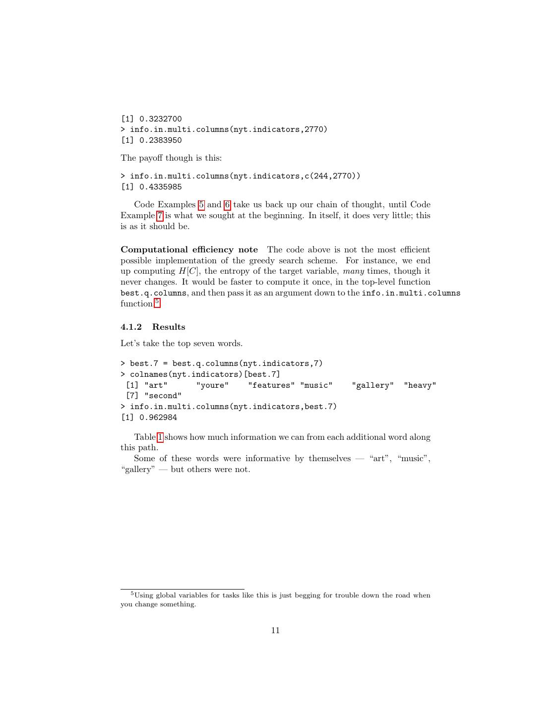 11 .[1] 0.3232700 > info.in.multi.columns(nyt.indicators,2770) [1] 0.2383950 The payoff though is this: > info.in.multi.columns(nyt.indicators,c(244,2770)) [1] 0.4335985 Code Examples 5 and 6 take us back up our chain of thought, until Code Example 7 is what we sought at the beginning. In itself, it does very little; this is as it should be. Computational efficiency note The code above is not the most efficient possible implementation of the greedy search scheme. For instance, we end up computing H[C], the entropy of the target variable, many times, though it never changes. It would be faster to compute it once, in the top-level function best.q.columns, and then pass it as an argument down to the info.in.multi.columns function.5 4.1.2 Results Let’s take the top seven words. > best.7 = best.q.columns(nyt.indicators,7) > colnames(nyt.indicators)[best.7] [1] "art" "youre" "features" "music" "gallery" "heavy" [7] "second" > info.in.multi.columns(nyt.indicators,best.7) [1] 0.962984 Table 1 shows how much information we can from each additional word along this path. Some of these words were informative by themselves — “art”, “music”, “gallery” — but others were not. 5 Using global variables for tasks like this is just begging for trouble down the road when you change something. 11