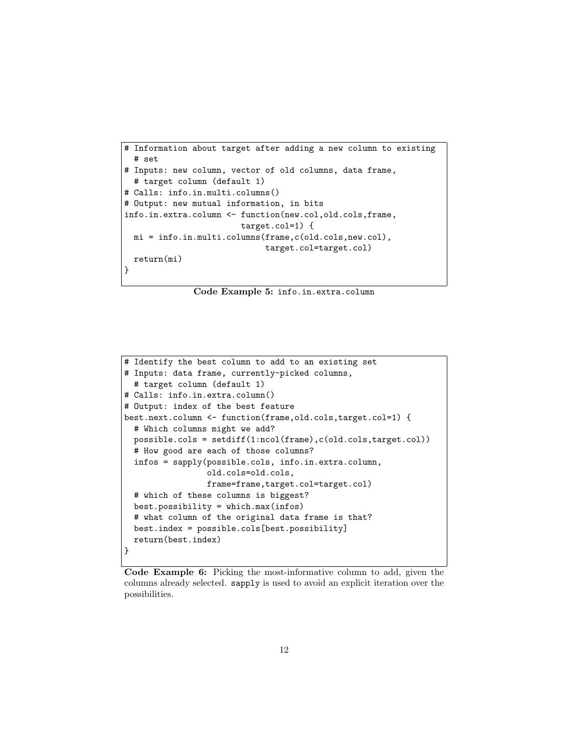 12 .# Information about target after adding a new column to existing # set # Inputs: new column, vector of old columns, data frame, # target column (default 1) # Calls: info.in.multi.columns() # Output: new mutual information, in bits info.in.extra.column <- function(new.col,old.cols,frame, target.col=1) { mi = info.in.multi.columns(frame,c(old.cols,new.col), target.col=target.col) return(mi) } Code Example 5: info.in.extra.column # Identify the best column to add to an existing set # Inputs: data frame, currently-picked columns, # target column (default 1) # Calls: info.in.extra.column() # Output: index of the best feature best.next.column <- function(frame,old.cols,target.col=1) { # Which columns might we add? possible.cols = setdiff(1:ncol(frame),c(old.cols,target.col)) # How good are each of those columns? infos = sapply(possible.cols, info.in.extra.column, old.cols=old.cols, frame=frame,target.col=target.col) # which of these columns is biggest? best.possibility = which.max(infos) # what column of the original data frame is that? best.index = possible.cols[best.possibility] return(best.index) } Code Example 6: Picking the most-informative column to add, given the columns already selected. sapply is used to avoid an explicit iteration over the possibilities. 12