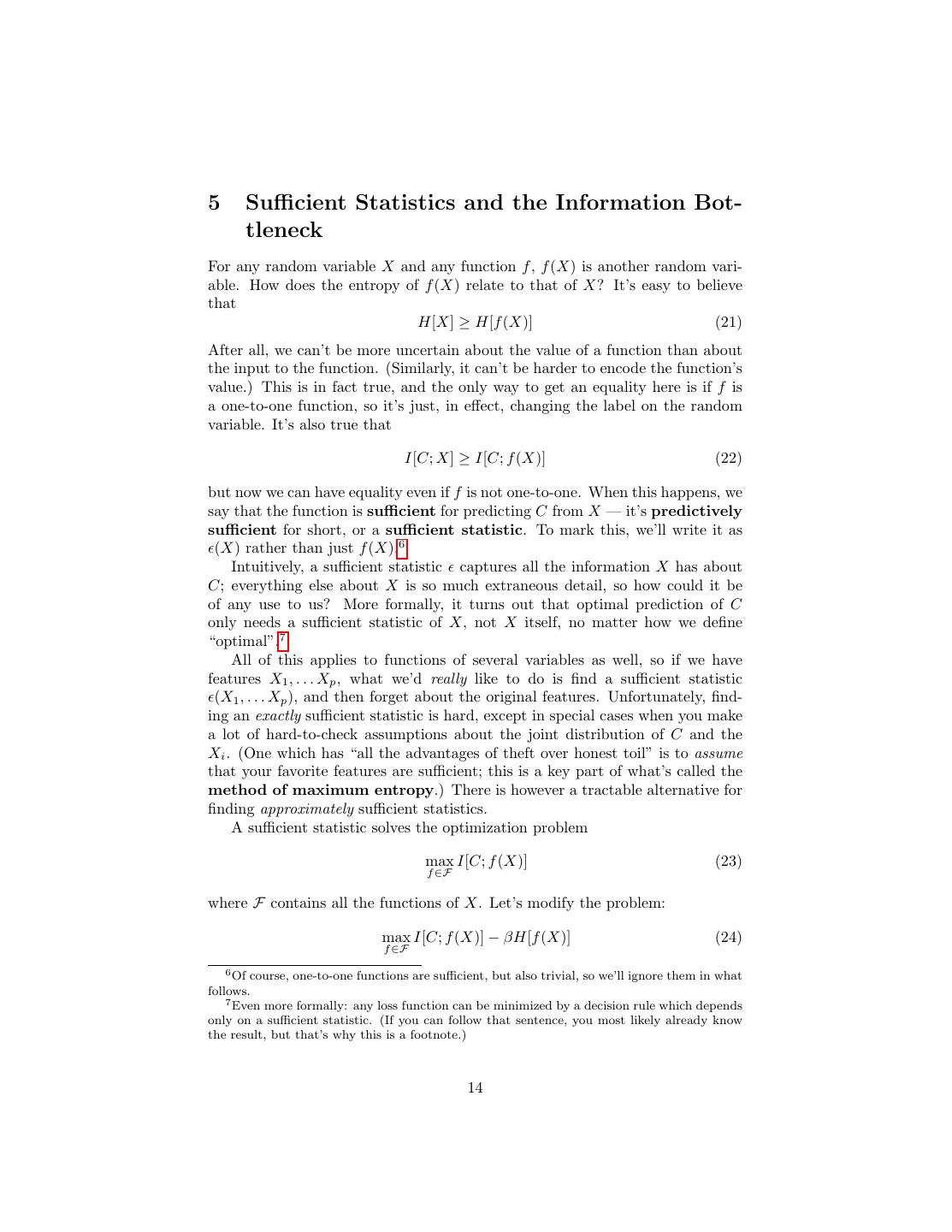 14 .5 Sufficient Statistics and the Information Bot- tleneck For any random variable X and any function f , f (X) is another random vari- able. How does the entropy of f (X) relate to that of X? It’s easy to believe that H[X] ≥ H[f (X)] (21) After all, we can’t be more uncertain about the value of a function than about the input to the function. (Similarly, it can’t be harder to encode the function’s value.) This is in fact true, and the only way to get an equality here is if f is a one-to-one function, so it’s just, in effect, changing the label on the random variable. It’s also true that I[C; X] ≥ I[C; f (X)] (22) but now we can have equality even if f is not one-to-one. When this happens, we say that the function is sufficient for predicting C from X — it’s predictively sufficient for short, or a sufficient statistic. To mark this, we’ll write it as (X) rather than just f (X).6 Intuitively, a sufficient statistic captures all the information X has about C; everything else about X is so much extraneous detail, so how could it be of any use to us? More formally, it turns out that optimal prediction of C only needs a sufficient statistic of X, not X itself, no matter how we define “optimal”.7 All of this applies to functions of several variables as well, so if we have features X1 , . . . Xp , what we’d really like to do is find a sufficient statistic (X1 , . . . Xp ), and then forget about the original features. Unfortunately, find- ing an exactly sufficient statistic is hard, except in special cases when you make a lot of hard-to-check assumptions about the joint distribution of C and the Xi . (One which has “all the advantages of theft over honest toil” is to assume that your favorite features are sufficient; this is a key part of what’s called the method of maximum entropy.) There is however a tractable alternative for finding approximately sufficient statistics. A sufficient statistic solves the optimization problem max I[C; f (X)] (23) f ∈F where F contains all the functions of X. Let’s modify the problem: max I[C; f (X)] − βH[f (X)] (24) f ∈F 6 Of course, one-to-one functions are sufficient, but also trivial, so we’ll ignore them in what follows. 7 Even more formally: any loss function can be minimized by a decision rule which depends only on a sufficient statistic. (If you can follow that sentence, you most likely already know the result, but that’s why this is a footnote.) 14