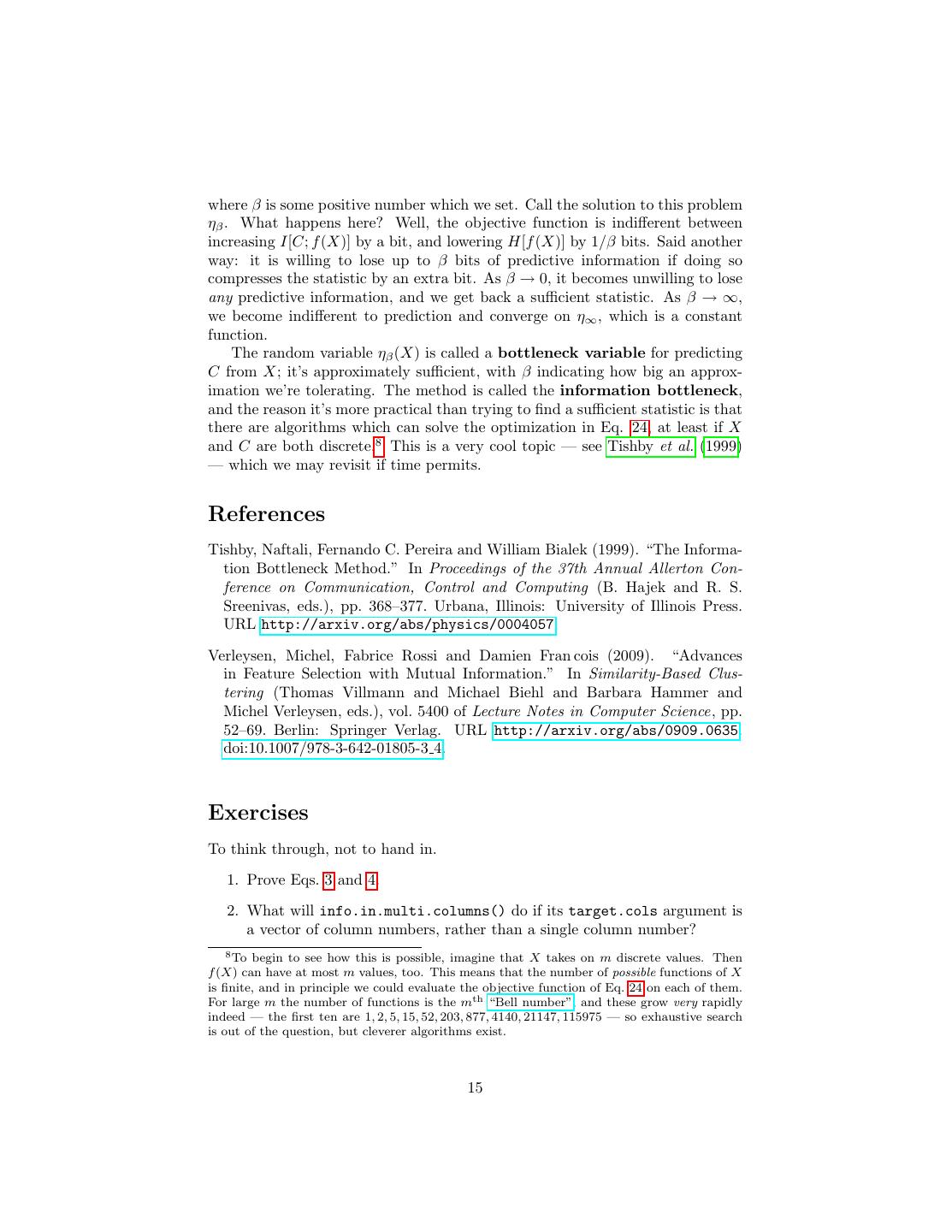 15 .where β is some positive number which we set. Call the solution to this problem ηβ . What happens here? Well, the objective function is indifferent between increasing I[C; f (X)] by a bit, and lowering H[f (X)] by 1/β bits. Said another way: it is willing to lose up to β bits of predictive information if doing so compresses the statistic by an extra bit. As β → 0, it becomes unwilling to lose any predictive information, and we get back a sufficient statistic. As β → ∞, we become indifferent to prediction and converge on η∞ , which is a constant function. The random variable ηβ (X) is called a bottleneck variable for predicting C from X; it’s approximately sufficient, with β indicating how big an approx- imation we’re tolerating. The method is called the information bottleneck, and the reason it’s more practical than trying to find a sufficient statistic is that there are algorithms which can solve the optimization in Eq. 24, at least if X and C are both discrete.8 This is a very cool topic — see Tishby et al. (1999) — which we may revisit if time permits. References Tishby, Naftali, Fernando C. Pereira and William Bialek (1999). “The Informa- tion Bottleneck Method.” In Proceedings of the 37th Annual Allerton Con- ference on Communication, Control and Computing (B. Hajek and R. S. Sreenivas, eds.), pp. 368–377. Urbana, Illinois: University of Illinois Press. URL http://arxiv.org/abs/physics/0004057. Verleysen, Michel, Fabrice Rossi and Damien Fran cois (2009). “Advances in Feature Selection with Mutual Information.” In Similarity-Based Clus- tering (Thomas Villmann and Michael Biehl and Barbara Hammer and Michel Verleysen, eds.), vol. 5400 of Lecture Notes in Computer Science, pp. 52–69. Berlin: Springer Verlag. URL http://arxiv.org/abs/0909.0635. doi:10.1007/978-3-642-01805-3 4. Exercises To think through, not to hand in. 1. Prove Eqs. 3 and 4. 2. What will info.in.multi.columns() do if its target.cols argument is a vector of column numbers, rather than a single column number? 8 To begin to see how this is possible, imagine that X takes on m discrete values. Then f (X) can have at most m values, too. This means that the number of possible functions of X is finite, and in principle we could evaluate the objective function of Eq. 24 on each of them. For large m the number of functions is the mth “Bell number”, and these grow very rapidly indeed — the first ten are 1, 2, 5, 15, 52, 203, 877, 4140, 21147, 115975 — so exhaustive search is out of the question, but cleverer algorithms exist. 15