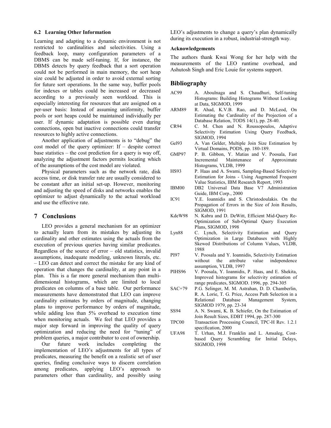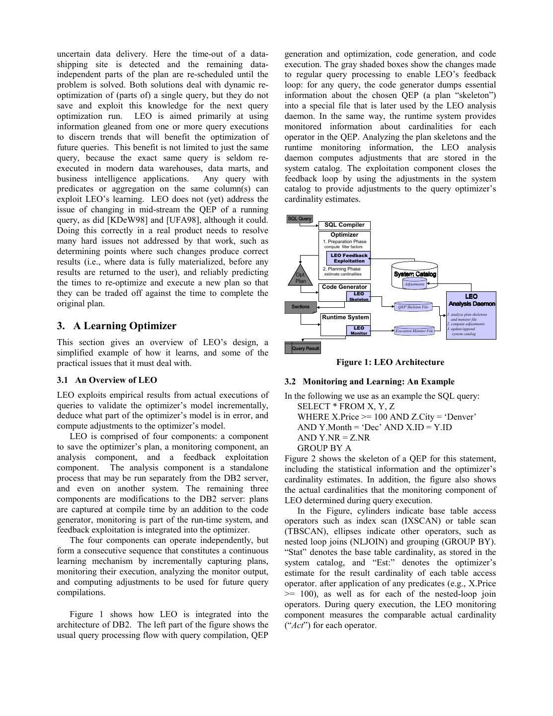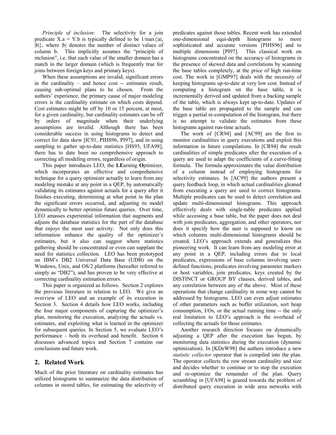 10 .6.2 Learning Other Information LEO’s adjustments to change a query’s plan dynamically Learning and adapting to a dynamic environment is not during its execution in a robust, industrial-strength way. restricted to cardinalities and selectivities. Using a Acknowledgements feedback loop, many configuration parameters of a DBMS can be made self-tuning. If, for instance, the The authors thank Kwai Wong for her help with the DBMS detects by query feedback that a sort operation measurements of the LEO runtime overhead, and could not be performed in main memory, the sort heap Ashutosh Singh and Eric Louie for systems support. size could be adjusted in order to avoid external sorting for future sort operations. In the same way, buffer pools Bibliography for indexes or tables could be increased or decreased AC99 A. Aboulnaga and S. Chaudhuri, Self-tuning according to a previously seen workload. This is Histograms: Building Histograms Without Looking especially interesting for resources that are assigned on a at Data, SIGMOD, 1999 per-user basis: Instead of assuming uniformity, buffer ARM89 R. Ahad, K.V.B. Rao, and D. McLeod, On pools or sort heaps could be maintained individually per Estimating the Cardinality of the Projection of a user. If dynamic adaptation is possible even during Database Relation, TODS 14(1), pp. 28-40. connections, open but inactive connections could transfer CR94 C. M. Chen and N. Roussopoulos, Adaptive Selectivity Estimation Using Query Feedback, resources to highly active connections. SIGMOD, 1994 Another application of adjustments is to “debug” the Gel93 A. Van Gelder, Multiple Join Size Estimation by cost model of the query optimizer: If – despite correct Virtual Domains, PODS, pp. 180-189. base statistics – the cost prediction for a query is way off, GMP97 P. B. Gibbon, Y. Matias and V. Poosala, Fast analyzing the adjustment factors permits locating which Incremental Maintenance of Approximate of the assumptions of the cost model are violated. Histograms, VLDB, 1999 Physical parameters such as the network rate, disk HS93 P. Haas and A. Swami, Sampling-Based Selectivity access time, or disk transfer rate are usually considered to Estimation for Joins - Using Augmented Frequent be constant after an initial set-up. However, monitoring Value Statistics, IBM Research Report, 1993 IBM00 DB2 Universal Data Base V7 Administration and adjusting the speed of disks and networks enables the Guide, IBM Corp., 2000 optimizer to adjust dynamically to the actual workload IC91 Y.E. Ioannidis and S. Christodoulakis. On the and use the effective rate. Propagation of Errors in the Size of Join Results, SIGMOD, 1991 7 Conclusions KdeW98 N. Kabra and D. DeWitt, Efficient Mid-Query Re- Optimization of Sub-Optimal Query Execution LEO provides a general mechanism for an optimizer Plans, SIGMOD, 1998 to actually learn from its mistakes by adjusting its Lyn88 C. Lynch, Selectivity Estimation and Query cardinality and other estimates using the actuals from the Optimization in Large Databases with Highly execution of previous queries having similar predicates. Skewed Distributions of Column Values, VLDB, Regardless of the source of error – old statistics, invalid 1988 assumptions, inadequate modeling, unknown literals, etc. PI97 V. Poosala and Y. Ioannidis, Selectivity Estimation without the attribute value independence – LEO can detect and correct the mistake for any kind of assumption, VLDB, 1997 operation that changes the cardinality, at any point in a PIHS96 V. Poosala, Y. Ioannidis, P. Haas, and E. Shekita, plan. This is a far more general mechanism than multi- Improved histograms for selectivity estimation of dimensional histograms, which are limited to local range predicates, SIGMOD. 1996, pp. 294-305 predicates on columns of a base table. Our performance SAC+79 P.G. Selinger, M. M. Astrahan, D. D. Chamberlin, measurements have demonstrated that LEO can improve R. A. Lorie, T. G. Price, Access Path Selection in a cardinality estimates by orders of magnitude, changing Relational Database Management System, plans to improve performance by orders of magnitude, SIGMOD 1979, pp. 23-34 while adding less than 5% overhead to execution time SS94 A. N. Swami, K. B. Schiefer, On the Estimation of Join Result Sizes, EDBT 1994, pp. 287-300 when monitoring actuals. We feel that LEO provides a TPC00 Transaction Processing Council, TPC-H Rev. 1.2.1 major step forward in improving the quality of query specification, 2000 optimization and reducing the need for “tuning” of UFA98 T. Urhan, M.J. Franklin and L. Amsaleg, Cost- problem queries, a major contributor to cost of ownership. based Query Scrambling for Initial Delays, Our future work includes completing the SIGMOD, 1998 implementation of LEO’s adjustments for all types of predicates, measuring the benefit on a realistic set of user queries, finding conclusive ways to discern correlation among predicates, applying LEO’s approach to parameters other than cardinality, and possibly using