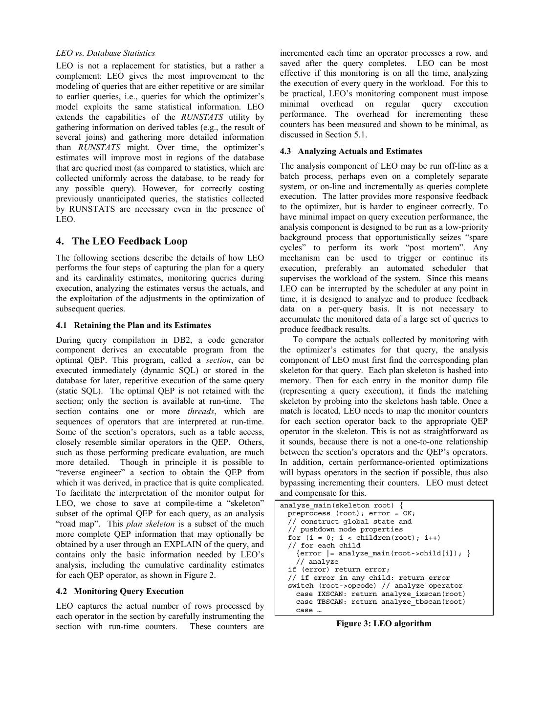 5 .LEO vs. Database Statistics incremented each time an operator processes a row, and LEO is not a replacement for statistics, but a rather a saved after the query completes. LEO can be most complement: LEO gives the most improvement to the effective if this monitoring is on all the time, analyzing modeling of queries that are either repetitive or are similar the execution of every query in the workload. For this to to earlier queries, i.e., queries for which the optimizer’s be practical, LEO’s monitoring component must impose model exploits the same statistical information. LEO minimal overhead on regular query execution extends the capabilities of the RUNSTATS utility by performance. The overhead for incrementing these gathering information on derived tables (e.g., the result of counters has been measured and shown to be minimal, as several joins) and gathering more detailed information discussed in Section 5.1. than RUNSTATS might. Over time, the optimizer’s 4.3 Analyzing Actuals and Estimates estimates will improve most in regions of the database that are queried most (as compared to statistics, which are The analysis component of LEO may be run off-line as a collected uniformly across the database, to be ready for batch process, perhaps even on a completely separate any possible query). However, for correctly costing system, or on-line and incrementally as queries complete previously unanticipated queries, the statistics collected execution. The latter provides more responsive feedback by RUNSTATS are necessary even in the presence of to the optimizer, but is harder to engineer correctly. To LEO. have minimal impact on query execution performance, the analysis component is designed to be run as a low-priority background process that opportunistically seizes “spare 4. The LEO Feedback Loop cycles” to perform its work “post mortem”. Any The following sections describe the details of how LEO mechanism can be used to trigger or continue its performs the four steps of capturing the plan for a query execution, preferably an automated scheduler that and its cardinality estimates, monitoring queries during supervises the workload of the system. Since this means execution, analyzing the estimates versus the actuals, and LEO can be interrupted by the scheduler at any point in the exploitation of the adjustments in the optimization of time, it is designed to analyze and to produce feedback subsequent queries. data on a per-query basis. It is not necessary to accumulate the monitored data of a large set of queries to 4.1 Retaining the Plan and its Estimates produce feedback results. During query compilation in DB2, a code generator To compare the actuals collected by monitoring with component derives an executable program from the the optimizer’s estimates for that query, the analysis optimal QEP. This program, called a section, can be component of LEO must first find the corresponding plan executed immediately (dynamic SQL) or stored in the skeleton for that query. Each plan skeleton is hashed into database for later, repetitive execution of the same query memory. Then for each entry in the monitor dump file (static SQL). The optimal QEP is not retained with the (representing a query execution), it finds the matching section; only the section is available at run-time. The skeleton by probing into the skeletons hash table. Once a section contains one or more threads, which are match is located, LEO needs to map the monitor counters sequences of operators that are interpreted at run-time. for each section operator back to the appropriate QEP Some of the section’s operators, such as a table access, operator in the skeleton. This is not as straightforward as closely resemble similar operators in the QEP. Others, it sounds, because there is not a one-to-one relationship such as those performing predicate evaluation, are much between the section’s operators and the QEP’s operators. more detailed. Though in principle it is possible to In addition, certain performance-oriented optimizations “reverse engineer” a section to obtain the QEP from will bypass operators in the section if possible, thus also which it was derived, in practice that is quite complicated. bypassing incrementing their counters. LEO must detect To facilitate the interpretation of the monitor output for and compensate for this. LEO, we chose to save at compile-time a “skeleton” analyze_main(skeleton root) { subset of the optimal QEP for each query, as an analysis preprocess (root); error = OK; “road map”. This plan skeleton is a subset of the much // construct global state and // pushdown node properties more complete QEP information that may optionally be for (i = 0; i < children(root); i++) obtained by a user through an EXPLAIN of the query, and // for each child contains only the basic information needed by LEO’s {error |= analyze_main(root->child[i]); } // analyze analysis, including the cumulative cardinality estimates if (error) return error; for each QEP operator, as shown in Figure 2. // if error in any child: return error switch (root->opcode) // analyze operator 4.2 Monitoring Query Execution case IXSCAN: return analyze_ixscan(root) case TBSCAN: return analyze_tbscan(root) LEO captures the actual number of rows processed by case … each operator in the section by carefully instrumenting the section with run-time counters. These counters are Figure 3: LEO algorithm