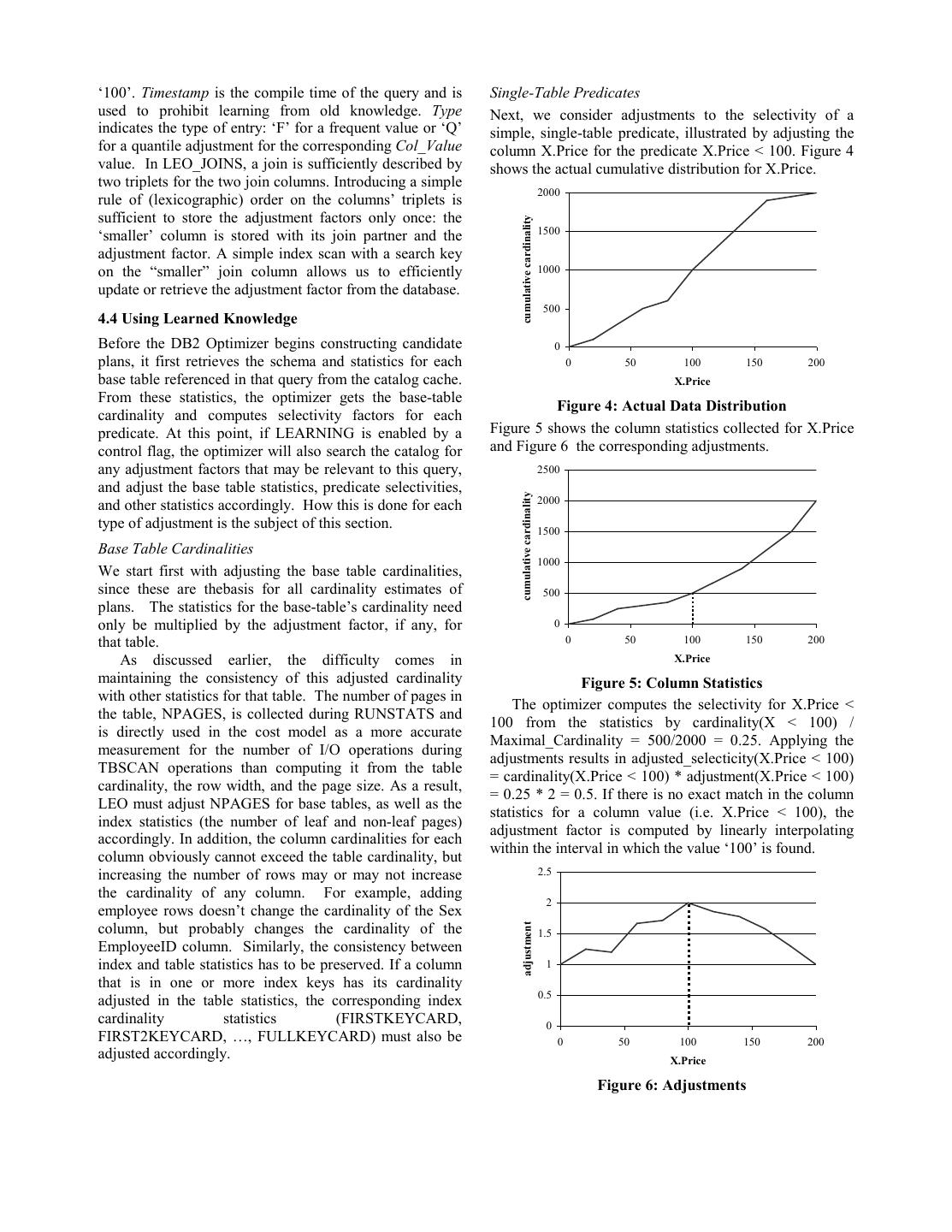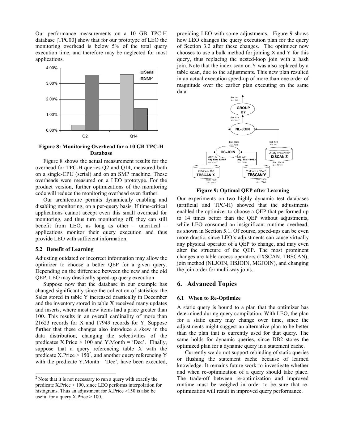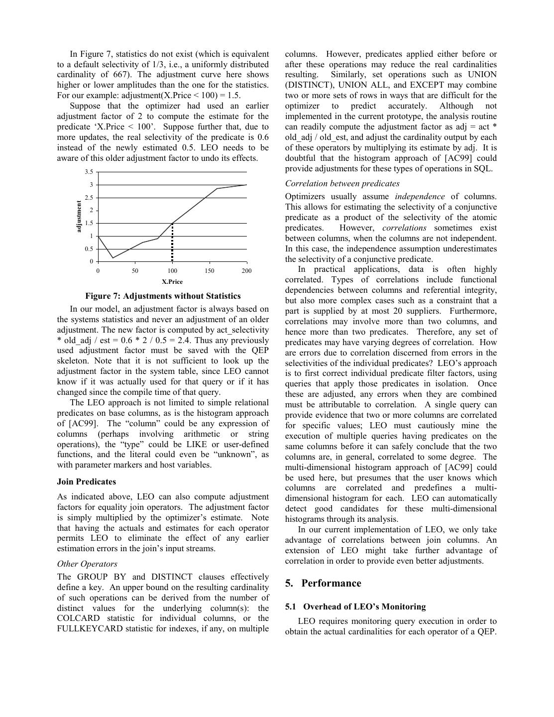 8 . In Figure 7, statistics do not exist (which is equivalent columns. However, predicates applied either before or to a default selectivity of 1/3, i.e., a uniformly distributed after these operations may reduce the real cardinalities cardinality of 667). The adjustment curve here shows resulting. Similarly, set operations such as UNION higher or lower amplitudes than the one for the statistics. (DISTINCT), UNION ALL, and EXCEPT may combine For our example: adjustment(X.Price < 100) = 1.5. two or more sets of rows in ways that are difficult for the Suppose that the optimizer had used an earlier optimizer to predict accurately. Although not adjustment factor of 2 to compute the estimate for the implemented in the current prototype, the analysis routine predicate ‘X.Price < 100’. Suppose further that, due to can readily compute the adjustment factor as adj = act * more updates, the real selectivity of the predicate is 0.6 old_adj / old_est, and adjust the cardinality output by each instead of the newly estimated 0.5. LEO needs to be of these operators by multiplying its estimate by adj. It is aware of this older adjustment factor to undo its effects. doubtful that the histogram approach of [AC99] could 3.5 provide adjustments for these types of operations in SQL. 3 Correlation between predicates 2.5 Optimizers usually assume independence of columns. adjustment 2 This allows for estimating the selectivity of a conjunctive predicate as a product of the selectivity of the atomic 1.5 predicates. However, correlations sometimes exist 1 between columns, when the columns are not independent. 0.5 In this case, the independence assumption underestimates 0 the selectivity of a conjunctive predicate. 0 50 100 150 200 In practical applications, data is often highly X.Price correlated. Types of correlations include functional dependencies between columns and referential integrity, Figure 7: Adjustments without Statistics but also more complex cases such as a constraint that a In our model, an adjustment factor is always based on part is supplied by at most 20 suppliers. Furthermore, the systems statistics and never an adjustment of an older correlations may involve more than two columns, and adjustment. The new factor is computed by act_selectivity hence more than two predicates. Therefore, any set of * old_adj / est = 0.6 * 2 / 0.5 = 2.4. Thus any previously predicates may have varying degrees of correlation. How used adjustment factor must be saved with the QEP are errors due to correlation discerned from errors in the skeleton. Note that it is not sufficient to look up the selectivities of the individual predicates? LEO’s approach adjustment factor in the system table, since LEO cannot is to first correct individual predicate filter factors, using know if it was actually used for that query or if it has queries that apply those predicates in isolation. Once changed since the compile time of that query. these are adjusted, any errors when they are combined The LEO approach is not limited to simple relational must be attributable to correlation. A single query can predicates on base columns, as is the histogram approach provide evidence that two or more columns are correlated of [AC99]. The “column” could be any expression of for specific values; LEO must cautiously mine the columns (perhaps involving arithmetic or string execution of multiple queries having predicates on the operations), the “type” could be LIKE or user-defined same columns before it can safely conclude that the two functions, and the literal could even be “unknown”, as columns are, in general, correlated to some degree. The with parameter markers and host variables. multi-dimensional histogram approach of [AC99] could Join Predicates be used here, but presumes that the user knows which columns are correlated and predefines a multi- As indicated above, LEO can also compute adjustment dimensional histogram for each. LEO can automatically factors for equality join operators. The adjustment factor detect good candidates for these multi-dimensional is simply multiplied by the optimizer’s estimate. Note histograms through its analysis. that having the actuals and estimates for each operator In our current implementation of LEO, we only take permits LEO to eliminate the effect of any earlier advantage of correlations between join columns. An estimation errors in the join’s input streams. extension of LEO might take further advantage of Other Operators correlation in order to provide even better adjustments. The GROUP BY and DISTINCT clauses effectively define a key. An upper bound on the resulting cardinality 5. Performance of such operations can be derived from the number of distinct values for the underlying column(s): the 5.1 Overhead of LEO’s Monitoring COLCARD statistic for individual columns, or the LEO requires monitoring query execution in order to FULLKEYCARD statistic for indexes, if any, on multiple obtain the actual cardinalities for each operator of a QEP.