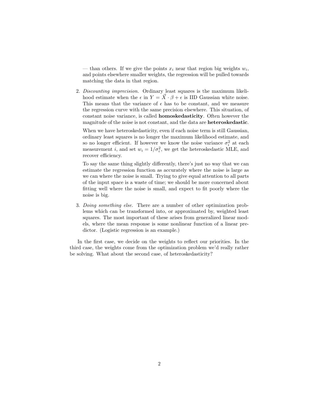 2 . — than others. If we give the points xi near that region big weights wi , and points elsewhere smaller weights, the regression will be pulled towards matching the data in that region. 2. Discounting imprecision. Ordinary least squares is the maximum likeli- hood estimate when the in Y = X · β + is IID Gaussian white noise. This means that the variance of has to be constant, and we measure the regression curve with the same precision elsewhere. This situation, of constant noise variance, is called homoskedasticity. Often however the magnitude of the noise is not constant, and the data are heteroskedastic. When we have heteroskedasticity, even if each noise term is still Gaussian, ordinary least squares is no longer the maximum likelihood estimate, and so no longer efficient. If however we know the noise variance σi2 at each measurement i, and set wi = 1/σi2 , we get the heteroskedastic MLE, and recover efficiency. To say the same thing slightly differently, there’s just no way that we can estimate the regression function as accurately where the noise is large as we can where the noise is small. Trying to give equal attention to all parts of the input space is a waste of time; we should be more concerned about fitting well where the noise is small, and expect to fit poorly where the noise is big. 3. Doing something else. There are a number of other optimization prob- lems which can be transformed into, or approximated by, weighted least squares. The most important of these arises from generalized linear mod- els, where the mean response is some nonlinear function of a linear pre- dictor. (Logistic regression is an example.) In the first case, we decide on the weights to reflect our priorities. In the third case, the weights come from the optimization problem we’d really rather be solving. What about the second case, of heteroskedasticity? 2