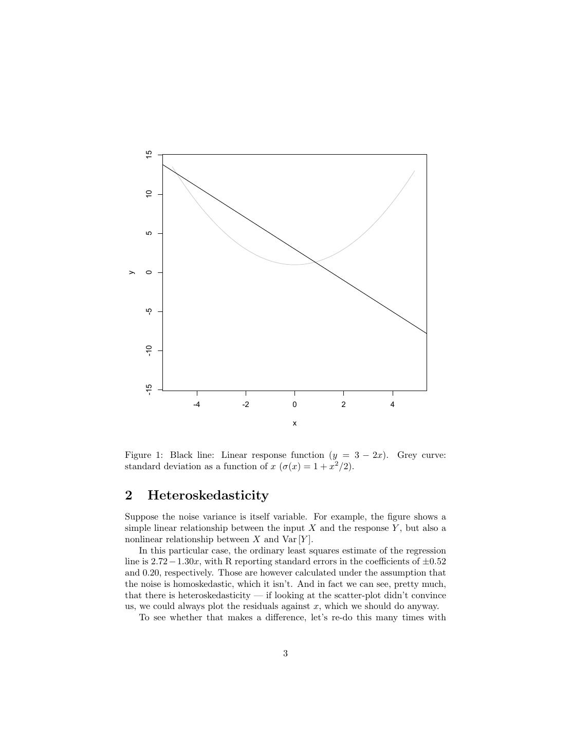 3 . 15 10 5 0 y -5 -10 -15 -4 -2 0 2 4 x Figure 1: Black line: Linear response function (y = 3 − 2x). Grey curve: standard deviation as a function of x (σ(x) = 1 + x2 /2). 2 Heteroskedasticity Suppose the noise variance is itself variable. For example, the figure shows a simple linear relationship between the input X and the response Y , but also a nonlinear relationship between X and Var [Y ]. In this particular case, the ordinary least squares estimate of the regression line is 2.72 − 1.30x, with R reporting standard errors in the coefficients of ±0.52 and 0.20, respectively. Those are however calculated under the assumption that the noise is homoskedastic, which it isn’t. And in fact we can see, pretty much, that there is heteroskedasticity — if looking at the scatter-plot didn’t convince us, we could always plot the residuals against x, which we should do anyway. To see whether that makes a difference, let’s re-do this many times with 3