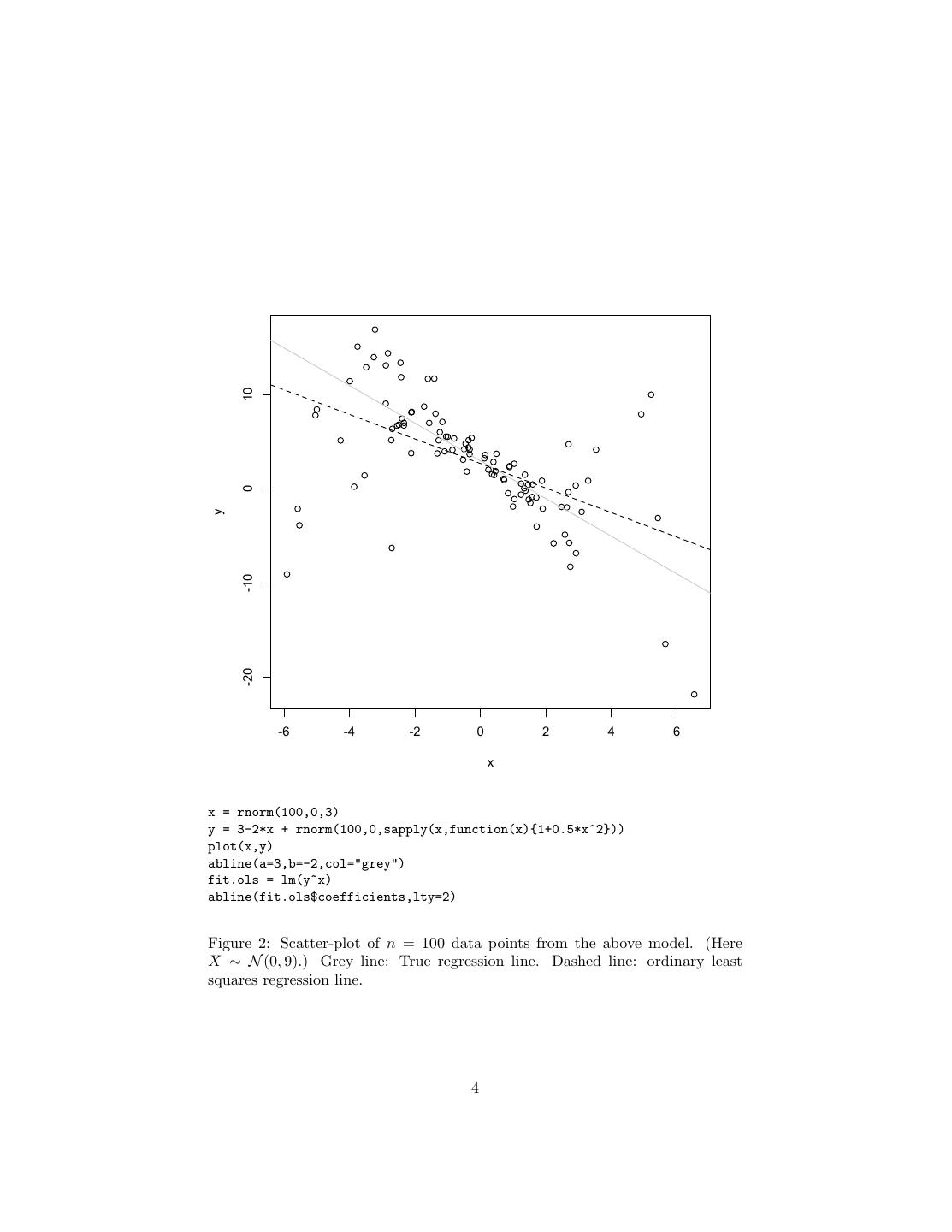 4 . 10 0 y -10 -20 -6 -4 -2 0 2 4 6 x x = rnorm(100,0,3) y = 3-2*x + rnorm(100,0,sapply(x,function(x){1+0.5*x^2})) plot(x,y) abline(a=3,b=-2,col="grey") fit.ols = lm(y~x) abline(fit.ols$coefficients,lty=2) Figure 2: Scatter-plot of n = 100 data points from the above model. (Here X ∼ N (0, 9).) Grey line: True regression line. Dashed line: ordinary least squares regression line. 4