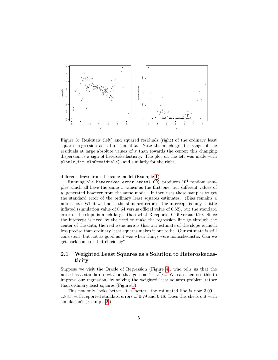 5 . 15 10 300 5 squared residuals 0 residuals 200 -5 -10 100 -15 0 -20 -6 -4 -2 0 2 4 6 -6 -4 -2 0 2 4 6 x x Figure 3: Residuals (left) and squared residuals (right) of the ordinary least squares regression as a function of x. Note the much greater range of the residuals at large absolute values of x than towards the center; this changing dispersion is a sign of heteroskedasticity. The plot on the left was made with plot(x,fit.ols$residuals), and similarly for the right. different draws from the same model (Example 1). Running ols.heterosked.error.stats(100) produces 104 random sam- ples which all have the same x values as the first one, but different values of y, generated however from the same model. It then uses those samples to get the standard error of the ordinary least squares estimates. (Bias remains a non-issue.) What we find is the standard error of the intercept is only a little inflated (simulation value of 0.64 versus official value of 0.52), but the standard error of the slope is much larger than what R reports, 0.46 versus 0.20. Since the intercept is fixed by the need to make the regression line go through the center of the data, the real issue here is that our estimate of the slope is much less precise than ordinary least squares makes it out to be. Our estimate is still consistent, but not as good as it was when things were homoskedastic. Can we get back some of that efficiency? 2.1 Weighted Least Squares as a Solution to Heteroskedas- ticity Suppose we visit the Oracle of Regression (Figure 4), who tells us that the noise has a standard deviation that goes as 1 + x2 /2. We can then use this to improve our regression, by solving the weighted least squares problem rather than ordinary least squares (Figure 5). This not only looks better, it is better: the estimated line is now 3.09 − 1.83x, with reported standard errors of 0.29 and 0.18. Does this check out with simulation? (Example 2.) 5