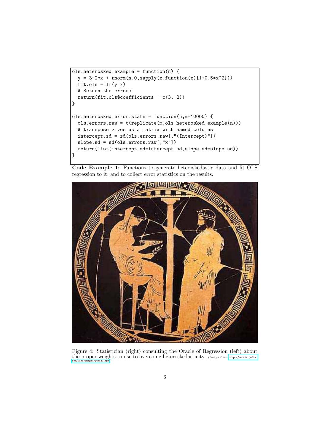 6 .ols.heterosked.example = function(n) { y = 3-2*x + rnorm(n,0,sapply(x,function(x){1+0.5*x^2})) fit.ols = lm(y~x) # Return the errors return(fit.ols$coefficients - c(3,-2)) } ols.heterosked.error.stats = function(n,m=10000) { ols.errors.raw = t(replicate(m,ols.heterosked.example(n))) # transpose gives us a matrix with named columns intercept.sd = sd(ols.errors.raw[,"(Intercept)"]) slope.sd = sd(ols.errors.raw[,"x"]) return(list(intercept.sd=intercept.sd,slope.sd=slope.sd)) } Code Example 1: Functions to generate heteroskedastic data and fit OLS regression to it, and to collect error statistics on the results. Figure 4: Statistician (right) consulting the Oracle of Regression (left) about the proper weights to use to overcome heteroskedasticity. (Image from http://en.wikipedia. org/wiki/Image:Pythia1.jpg.) 6
