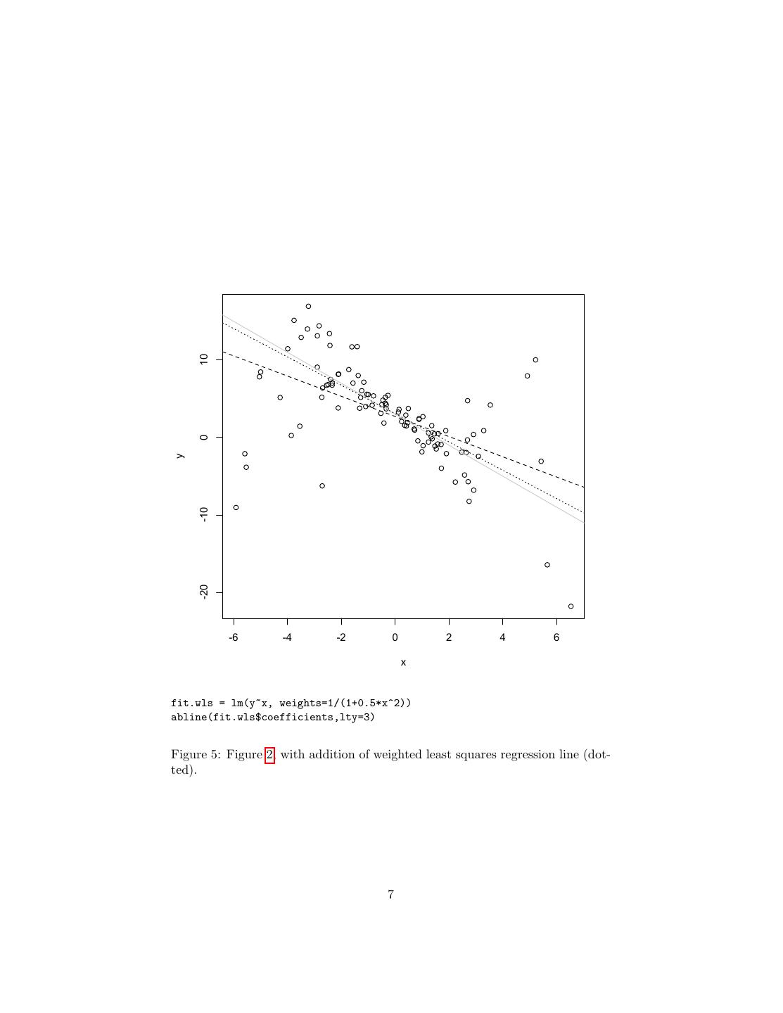 7 . 10 0 y -10 -20 -6 -4 -2 0 2 4 6 x fit.wls = lm(y~x, weights=1/(1+0.5*x^2)) abline(fit.wls$coefficients,lty=3) Figure 5: Figure 2, with addition of weighted least squares regression line (dot- ted). 7
