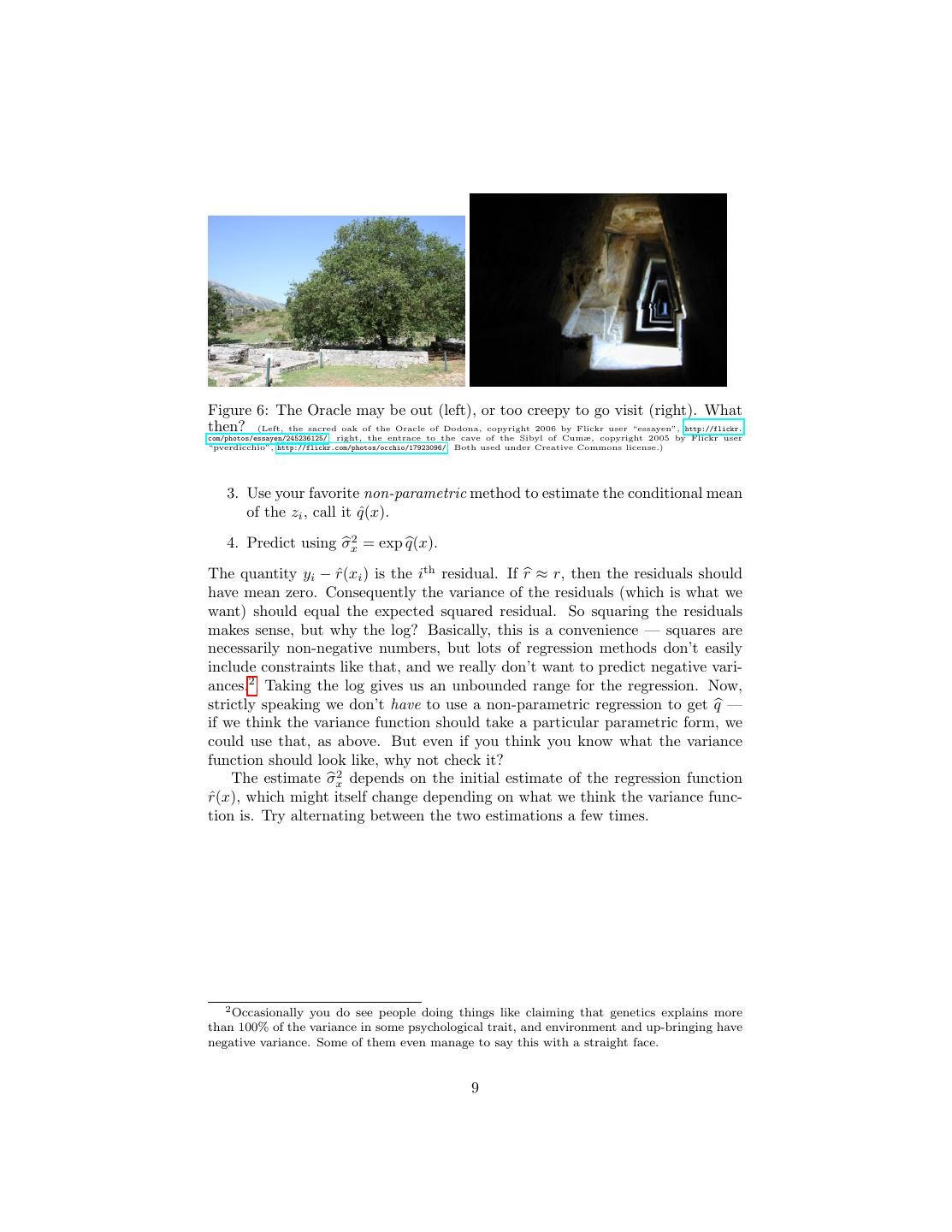 9 .Figure 6: The Oracle may be out (left), or too creepy to go visit (right). What then? (Left, the sacred oak of the Oracle of Dodona, copyright 2006 by Flickr user “essayen”, http://flickr. com/photos/essayen/245236125/; right, the entrace to the cave of the Sibyl of Cumæ, copyright 2005 by Flickr user “pverdicchio”, http://flickr.com/photos/occhio/17923096/. Both used under Creative Commons license.) 3. Use your favorite non-parametric method to estimate the conditional mean of the zi , call it qˆ(x). 4. Predict using σx2 = exp q(x). The quantity yi − rˆ(xi ) is the ith residual. If r ≈ r, then the residuals should have mean zero. Consequently the variance of the residuals (which is what we want) should equal the expected squared residual. So squaring the residuals makes sense, but why the log? Basically, this is a convenience — squares are necessarily non-negative numbers, but lots of regression methods don’t easily include constraints like that, and we really don’t want to predict negative vari- ances.2 Taking the log gives us an unbounded range for the regression. Now, strictly speaking we don’t have to use a non-parametric regression to get q — if we think the variance function should take a particular parametric form, we could use that, as above. But even if you think you know what the variance function should look like, why not check it? The estimate σx2 depends on the initial estimate of the regression function rˆ(x), which might itself change depending on what we think the variance func- tion is. Try alternating between the two estimations a few times. 2 Occasionally you do see people doing things like claiming that genetics explains more than 100% of the variance in some psychological trait, and environment and up-bringing have negative variance. Some of them even manage to say this with a straight face. 9