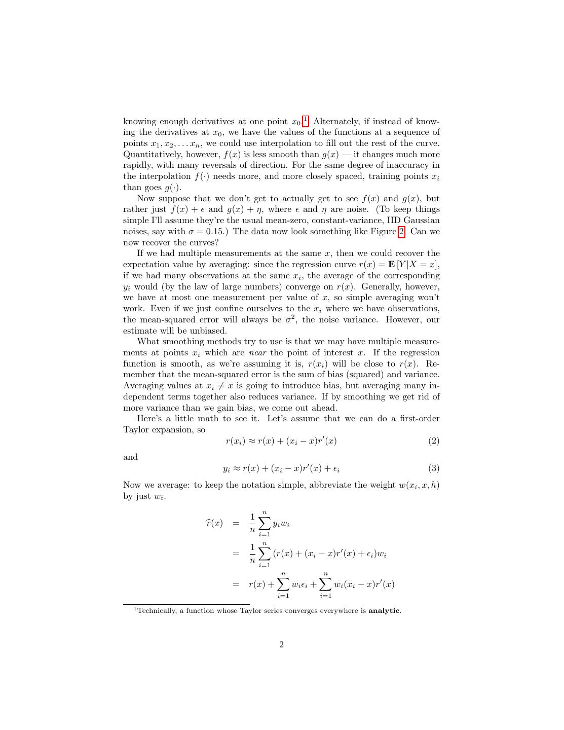 2 .knowing enough derivatives at one point x0 .1 Alternately, if instead of know- ing the derivatives at x0 , we have the values of the functions at a sequence of points x1 , x2 , . . . xn , we could use interpolation to fill out the rest of the curve. Quantitatively, however, f (x) is less smooth than g(x) — it changes much more rapidly, with many reversals of direction. For the same degree of inaccuracy in the interpolation f (·) needs more, and more closely spaced, training points xi than goes g(·). Now suppose that we don’t get to actually get to see f (x) and g(x), but rather just f (x) + and g(x) + η, where and η are noise. (To keep things simple I’ll assume they’re the usual mean-zero, constant-variance, IID Gaussian noises, say with σ = 0.15.) The data now look something like Figure 2. Can we now recover the curves? If we had multiple measurements at the same x, then we could recover the expectation value by averaging: since the regression curve r(x) = E [Y |X = x], if we had many observations at the same xi , the average of the corresponding yi would (by the law of large numbers) converge on r(x). Generally, however, we have at most one measurement per value of x, so simple averaging won’t work. Even if we just confine ourselves to the xi where we have observations, the mean-squared error will always be σ 2 , the noise variance. However, our estimate will be unbiased. What smoothing methods try to use is that we may have multiple measure- ments at points xi which are near the point of interest x. If the regression function is smooth, as we’re assuming it is, r(xi ) will be close to r(x). Re- member that the mean-squared error is the sum of bias (squared) and variance. Averaging values at xi = x is going to introduce bias, but averaging many in- dependent terms together also reduces variance. If by smoothing we get rid of more variance than we gain bias, we come out ahead. Here’s a little math to see it. Let’s assume that we can do a first-order Taylor expansion, so r(xi ) ≈ r(x) + (xi − x)r (x) (2) and yi ≈ r(x) + (xi − x)r (x) + i (3) Now we average: to keep the notation simple, abbreviate the weight w(xi , x, h) by just wi . n 1 r(x) = yi wi n i=1 n 1 = (r(x) + (xi − x)r (x) + i )wi n i=1 n n = r(x) + wi i + wi (xi − x)r (x) i=1 i=1 1 Technically, a function whose Taylor series converges everywhere is analytic. 2