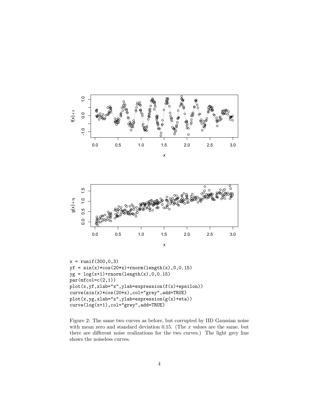 4 . 1.0 f(x) + ε 0.0 -1.0 0.0 0.5 1.0 1.5 2.0 2.5 3.0 x 1.5 g(x) + η 1.0 0.5 0.0 0.0 0.5 1.0 1.5 2.0 2.5 3.0 x x = runif(300,0,3) yf = sin(x)*cos(20*x)+rnorm(length(x),0,0.15) yg = log(x+1)+rnorm(length(x),0,0.15) par(mfcol=c(2,1)) plot(x,yf,xlab="x",ylab=expression(f(x)+epsilon)) curve(sin(x)*cos(20*x),col="grey",add=TRUE) plot(x,yg,xlab="x",ylab=expression(g(x)+eta)) curve(log(x+1),col="grey",add=TRUE) Figure 2: The same two curves as before, but corrupted by IID Gaussian noise with mean zero and standard deviation 0.15. (The x values are the same, but there are different noise realizations for the two curves.) The light grey line shows the noiseless curves. 4