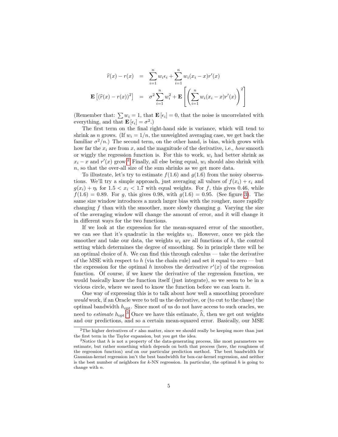 5 . n n r(x) − r(x) = wi i + wi (xi − x)r (x) i=1 i=1 n n 2 E (r(x) − r(x))2 = σ2 wi2 + E wi (xi − x)r (x) i=1 i=1 (Remember that: wi = 1, that E [ i ] = 0, that the noise is uncorrelated with everything, and that E [ i ] = σ 2 .) The first term on the final right-hand side is variance, which will tend to shrink as n grows. (If wi = 1/n, the unweighted averaging case, we get back the familiar σ 2 /n.) The second term, on the other hand, is bias, which grows with how far the xi are from x, and the magnitude of the derivative, i.e., how smooth or wiggly the regression function is. For this to work, wi had better shrink as xi − x and r (x) grow.2 Finally, all else being equal, wi should also shrink with n, so that the over-all size of the sum shrinks as we get more data. To illustrate, let’s try to estimate f (1.6) and g(1.6) from the noisy observa- tions. We’ll try a simple approach, just averaging all values of f (xi ) + i and g(xi ) + ηi for 1.5 < xi < 1.7 with equal weights. For f , this gives 0.46, while f (1.6) = 0.89. For g, this gives 0.98, with g(1.6) = 0.95. (See figure 3). The same size window introduces a much larger bias with the rougher, more rapidly changing f than with the smoother, more slowly changing g. Varying the size of the averaging window will change the amount of error, and it will change it in different ways for the two functions. If we look at the expression for the mean-squared error of the smoother, we can see that it’s quadratic in the weights wi . However, once we pick the smoother and take our data, the weights wi are all functions of h, the control setting which determines the degree of smoothing. So in principle there will be an optimal choice of h. We can find this through calculus — take the derivative of the MSE with respect to h (via the chain rule) and set it equal to zero — but the expression for the optimal h involves the derivative r (x) of the regression function. Of course, if we knew the derivative of the regression function, we would basically know the function itself (just integrate), so we seem to be in a vicious circle, where we need to know the function before we can learn it. One way of expressing this is to talk about how well a smoothing procedure would work, if an Oracle were to tell us the derivative, or (to cut to the chase) the optimal bandwidth hopt . Since most of us do not have access to such oracles, we need to estimate hopt .3 Once we have this estimate, h, then we get out weights and our predictions, and so a certain mean-squared error. Basically, our MSE 2 The higher derivatives of r also matter, since we should really be keeping more than just the first term in the Taylor expansion, but you get the idea. 3 Notice that h is not a property of the data-generating process, like most parameters we estimate, but rather something which depends on both that process (here, the roughness of the regression function) and on our particular prediction method. The best bandwidth for Gaussian-kernel regression isn’t the best bandwidth for box-car-kernel regression, and neither is the best number of neighbors for k-NN regression. In particular, the optimal h is going to change with n. 5