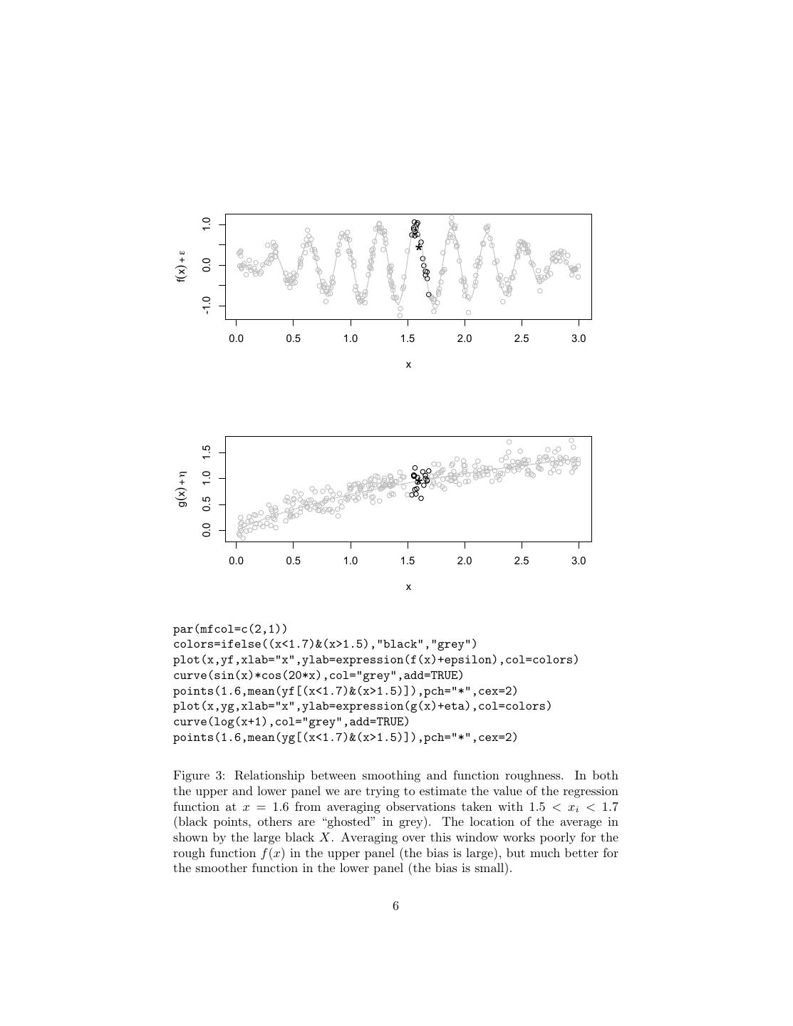 6 . 1.0 * f(x) + ε 0.0 -1.0 0.0 0.5 1.0 1.5 2.0 2.5 3.0 x 1.5 g(x) + η 1.0 * 0.5 0.0 0.0 0.5 1.0 1.5 2.0 2.5 3.0 x par(mfcol=c(2,1)) colors=ifelse((x<1.7)&(x>1.5),"black","grey") plot(x,yf,xlab="x",ylab=expression(f(x)+epsilon),col=colors) curve(sin(x)*cos(20*x),col="grey",add=TRUE) points(1.6,mean(yf[(x<1.7)&(x>1.5)]),pch="*",cex=2) plot(x,yg,xlab="x",ylab=expression(g(x)+eta),col=colors) curve(log(x+1),col="grey",add=TRUE) points(1.6,mean(yg[(x<1.7)&(x>1.5)]),pch="*",cex=2) Figure 3: Relationship between smoothing and function roughness. In both the upper and lower panel we are trying to estimate the value of the regression function at x = 1.6 from averaging observations taken with 1.5 < xi < 1.7 (black points, others are “ghosted” in grey). The location of the average in shown by the large black X. Averaging over this window works poorly for the rough function f (x) in the upper panel (the bias is large), but much better for the smoother function in the lower panel (the bias is small). 6