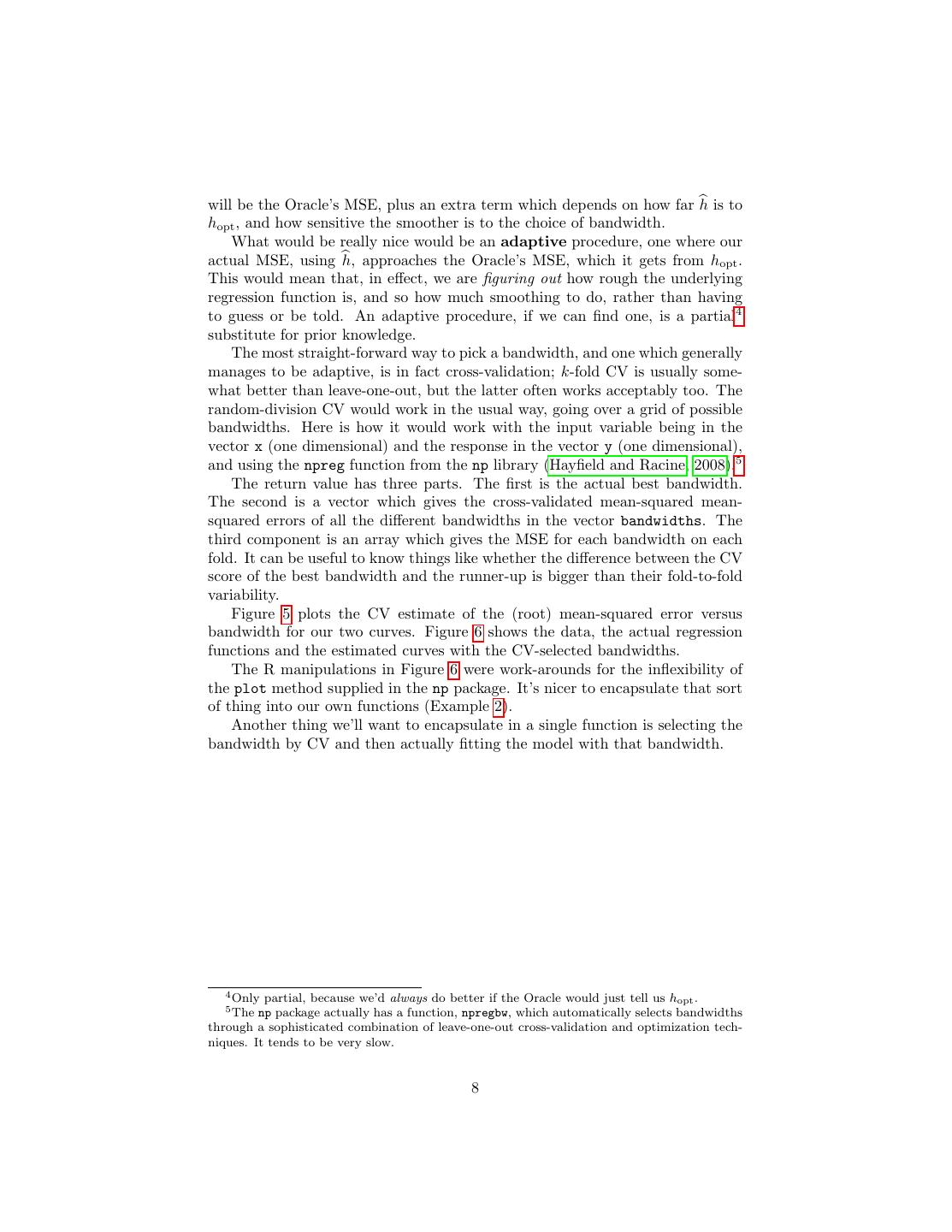 8 .will be the Oracle’s MSE, plus an extra term which depends on how far h is to hopt , and how sensitive the smoother is to the choice of bandwidth. What would be really nice would be an adaptive procedure, one where our actual MSE, using h, approaches the Oracle’s MSE, which it gets from hopt . This would mean that, in effect, we are figuring out how rough the underlying regression function is, and so how much smoothing to do, rather than having to guess or be told. An adaptive procedure, if we can find one, is a partial4 substitute for prior knowledge. The most straight-forward way to pick a bandwidth, and one which generally manages to be adaptive, is in fact cross-validation; k-fold CV is usually some- what better than leave-one-out, but the latter often works acceptably too. The random-division CV would work in the usual way, going over a grid of possible bandwidths. Here is how it would work with the input variable being in the vector x (one dimensional) and the response in the vector y (one dimensional), and using the npreg function from the np library (Hayfield and Racine, 2008).5 The return value has three parts. The first is the actual best bandwidth. The second is a vector which gives the cross-validated mean-squared mean- squared errors of all the different bandwidths in the vector bandwidths. The third component is an array which gives the MSE for each bandwidth on each fold. It can be useful to know things like whether the difference between the CV score of the best bandwidth and the runner-up is bigger than their fold-to-fold variability. Figure 5 plots the CV estimate of the (root) mean-squared error versus bandwidth for our two curves. Figure 6 shows the data, the actual regression functions and the estimated curves with the CV-selected bandwidths. The R manipulations in Figure 6 were work-arounds for the inflexibility of the plot method supplied in the np package. It’s nicer to encapsulate that sort of thing into our own functions (Example 2). Another thing we’ll want to encapsulate in a single function is selecting the bandwidth by CV and then actually fitting the model with that bandwidth. 4 Only partial, because we’d always do better if the Oracle would just tell us hopt . 5 The np package actually has a function, npregbw, which automatically selects bandwidths through a sophisticated combination of leave-one-out cross-validation and optimization tech- niques. It tends to be very slow. 8