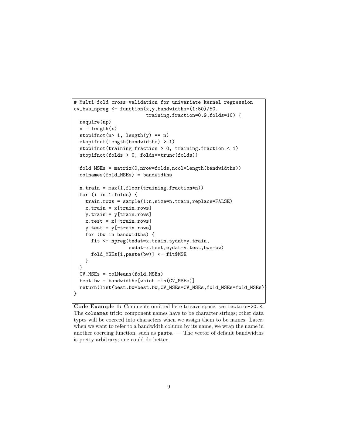 9 .# Multi-fold cross-validation for univariate kernel regression cv_bws_npreg <- function(x,y,bandwidths=(1:50)/50, training.fraction=0.9,folds=10) { require(np) n = length(x) stopifnot(n> 1, length(y) == n) stopifnot(length(bandwidths) > 1) stopifnot(training.fraction > 0, training.fraction < 1) stopifnot(folds > 0, folds==trunc(folds)) fold_MSEs = matrix(0,nrow=folds,ncol=length(bandwidths)) colnames(fold_MSEs) = bandwidths n.train = max(1,floor(training.fraction*n)) for (i in 1:folds) { train.rows = sample(1:n,size=n.train,replace=FALSE) x.train = x[train.rows] y.train = y[train.rows] x.test = x[-train.rows] y.test = y[-train.rows] for (bw in bandwidths) { fit <- npreg(txdat=x.train,tydat=y.train, exdat=x.test,eydat=y.test,bws=bw) fold_MSEs[i,paste(bw)] <- fit$MSE } } CV_MSEs = colMeans(fold_MSEs) best.bw = bandwidths[which.min(CV_MSEs)] return(list(best.bw=best.bw,CV_MSEs=CV_MSEs,fold_MSEs=fold_MSEs)) } Code Example 1: Comments omitted here to save space; see lecture-20.R. The colnames trick: component names have to be character strings; other data types will be coerced into characters when we assign them to be names. Later, when we want to refer to a bandwidth column by its name, we wrap the name in another coercing function, such as paste. — The vector of default bandwidths is pretty arbitrary; one could do better. 9