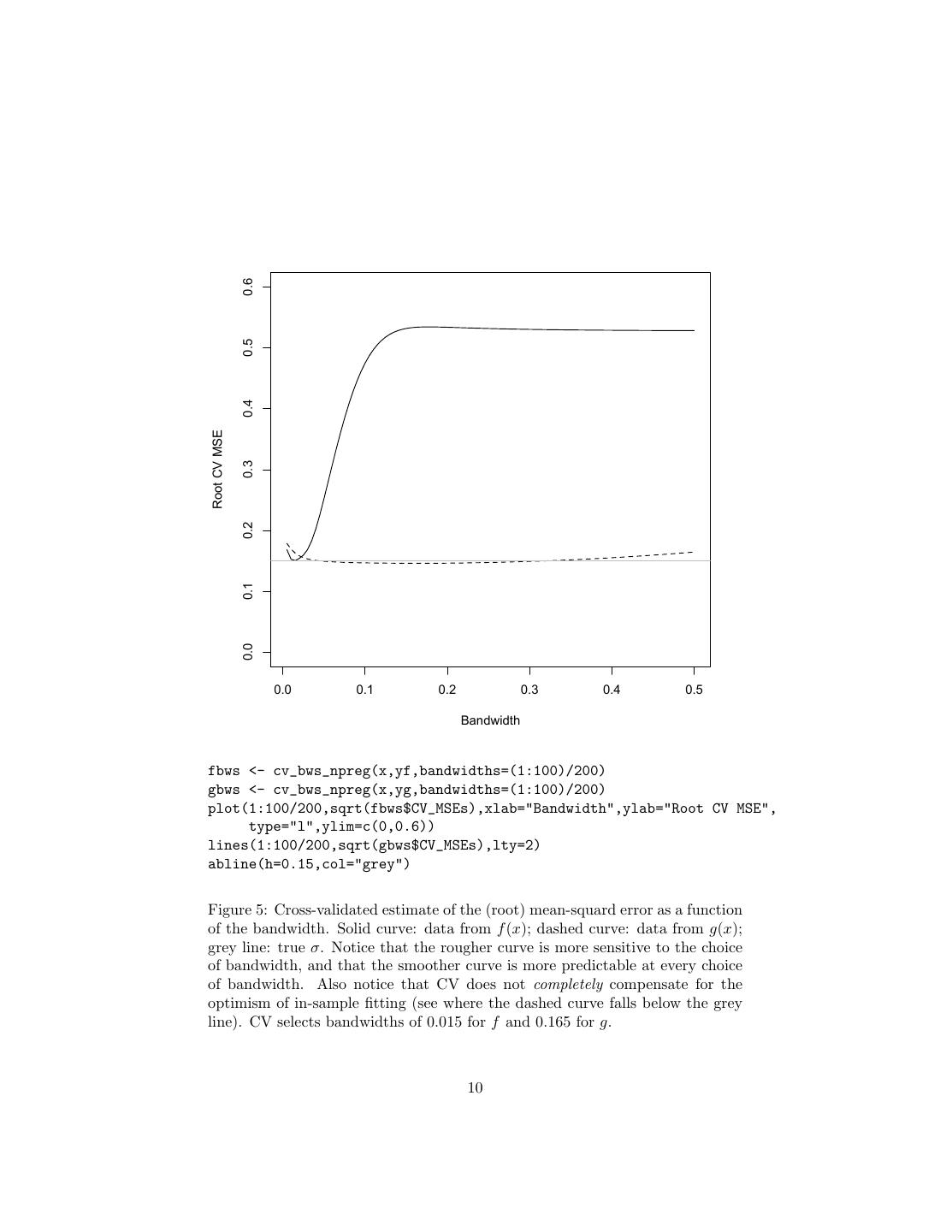 10 . 0.6 0.5 0.4 Root CV MSE 0.3 0.2 0.1 0.0 0.0 0.1 0.2 0.3 0.4 0.5 Bandwidth fbws <- cv_bws_npreg(x,yf,bandwidths=(1:100)/200) gbws <- cv_bws_npreg(x,yg,bandwidths=(1:100)/200) plot(1:100/200,sqrt(fbws$CV_MSEs),xlab="Bandwidth",ylab="Root CV MSE", type="l",ylim=c(0,0.6)) lines(1:100/200,sqrt(gbws$CV_MSEs),lty=2) abline(h=0.15,col="grey") Figure 5: Cross-validated estimate of the (root) mean-squard error as a function of the bandwidth. Solid curve: data from f (x); dashed curve: data from g(x); grey line: true σ. Notice that the rougher curve is more sensitive to the choice of bandwidth, and that the smoother curve is more predictable at every choice of bandwidth. Also notice that CV does not completely compensate for the optimism of in-sample fitting (see where the dashed curve falls below the grey line). CV selects bandwidths of 0.015 for f and 0.165 for g. 10