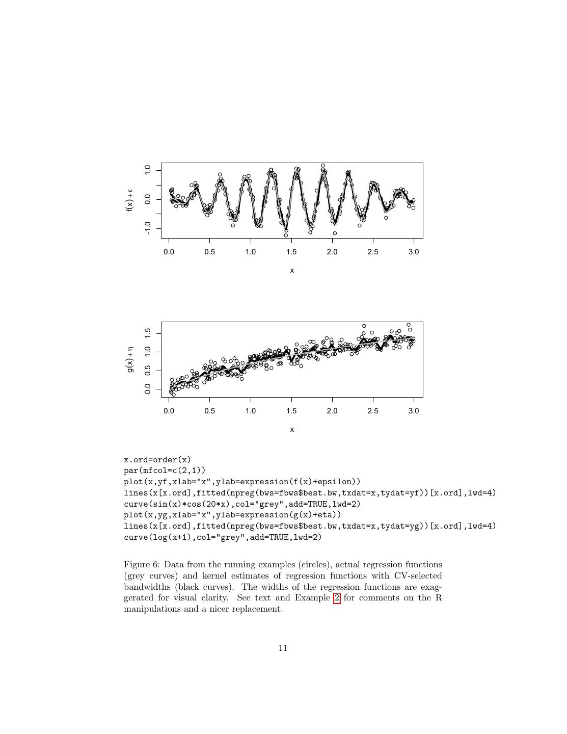 11 . 1.0 f(x) + ε 0.0 -1.0 0.0 0.5 1.0 1.5 2.0 2.5 3.0 x 1.5 g(x) + η 1.0 0.5 0.0 0.0 0.5 1.0 1.5 2.0 2.5 3.0 x x.ord=order(x) par(mfcol=c(2,1)) plot(x,yf,xlab="x",ylab=expression(f(x)+epsilon)) lines(x[x.ord],fitted(npreg(bws=fbws$best.bw,txdat=x,tydat=yf))[x.ord],lwd=4) curve(sin(x)*cos(20*x),col="grey",add=TRUE,lwd=2) plot(x,yg,xlab="x",ylab=expression(g(x)+eta)) lines(x[x.ord],fitted(npreg(bws=fbws$best.bw,txdat=x,tydat=yg))[x.ord],lwd=4) curve(log(x+1),col="grey",add=TRUE,lwd=2) Figure 6: Data from the running examples (circles), actual regression functions (grey curves) and kernel estimates of regression functions with CV-selected bandwidths (black curves). The widths of the regression functions are exag- gerated for visual clarity. See text and Example 2 for comments on the R manipulations and a nicer replacement. 11