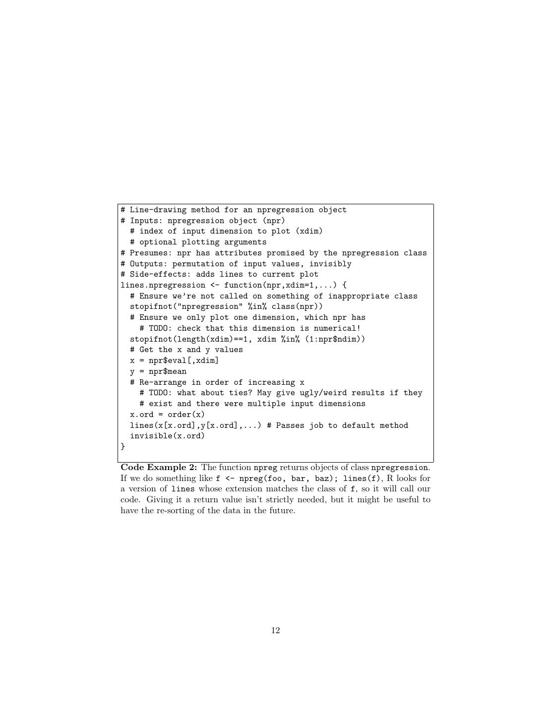 12 .# Line-drawing method for an npregression object # Inputs: npregression object (npr) # index of input dimension to plot (xdim) # optional plotting arguments # Presumes: npr has attributes promised by the npregression class # Outputs: permutation of input values, invisibly # Side-effects: adds lines to current plot lines.npregression <- function(npr,xdim=1,...) { # Ensure we’re not called on something of inappropriate class stopifnot("npregression" %in% class(npr)) # Ensure we only plot one dimension, which npr has # TODO: check that this dimension is numerical! stopifnot(length(xdim)==1, xdim %in% (1:npr$ndim)) # Get the x and y values x = npr$eval[,xdim] y = npr$mean # Re-arrange in order of increasing x # TODO: what about ties? May give ugly/weird results if they # exist and there were multiple input dimensions x.ord = order(x) lines(x[x.ord],y[x.ord],...) # Passes job to default method invisible(x.ord) } Code Example 2: The function npreg returns objects of class npregression. If we do something like f <- npreg(foo, bar, baz); lines(f), R looks for a version of lines whose extension matches the class of f, so it will call our code. Giving it a return value isn’t strictly needed, but it might be useful to have the re-sorting of the data in the future. 12