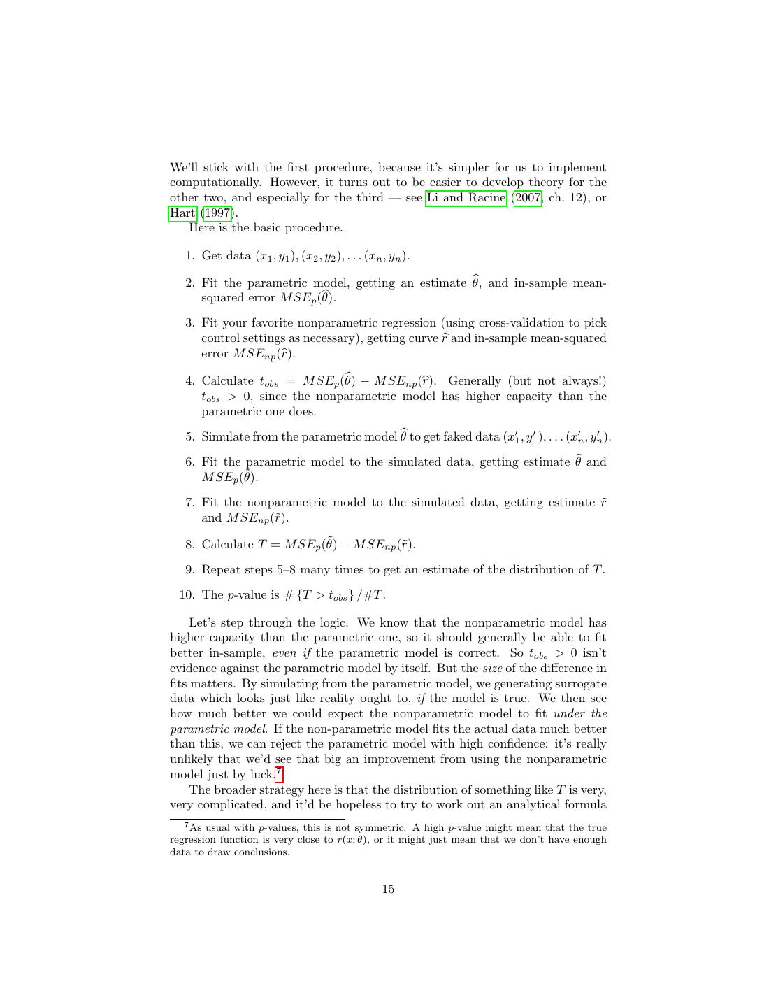 15 .We’ll stick with the first procedure, because it’s simpler for us to implement computationally. However, it turns out to be easier to develop theory for the other two, and especially for the third — see Li and Racine (2007, ch. 12), or Hart (1997). Here is the basic procedure. 1. Get data (x1 , y1 ), (x2 , y2 ), . . . (xn , yn ). 2. Fit the parametric model, getting an estimate θ, and in-sample mean- squared error M SEp (θ). 3. Fit your favorite nonparametric regression (using cross-validation to pick control settings as necessary), getting curve r and in-sample mean-squared error M SEnp (r). 4. Calculate tobs = M SEp (θ) − M SEnp (r). Generally (but not always!) tobs > 0, since the nonparametric model has higher capacity than the parametric one does. 5. Simulate from the parametric model θ to get faked data (x1 , y1 ), . . . (xn , yn ). 6. Fit the parametric model to the simulated data, getting estimate θ˜ and ˜ M SEp (θ). 7. Fit the nonparametric model to the simulated data, getting estimate r˜ and M SEnp (˜ r). ˜ − M SEnp (˜ 8. Calculate T = M SEp (θ) r). 9. Repeat steps 5–8 many times to get an estimate of the distribution of T . 10. The p-value is # {T > tobs } /#T . Let’s step through the logic. We know that the nonparametric model has higher capacity than the parametric one, so it should generally be able to fit better in-sample, even if the parametric model is correct. So tobs > 0 isn’t evidence against the parametric model by itself. But the size of the difference in fits matters. By simulating from the parametric model, we generating surrogate data which looks just like reality ought to, if the model is true. We then see how much better we could expect the nonparametric model to fit under the parametric model. If the non-parametric model fits the actual data much better than this, we can reject the parametric model with high confidence: it’s really unlikely that we’d see that big an improvement from using the nonparametric model just by luck.7 The broader strategy here is that the distribution of something like T is very, very complicated, and it’d be hopeless to try to work out an analytical formula 7 As usual with p-values, this is not symmetric. A high p-value might mean that the true regression function is very close to r(x; θ), or it might just mean that we don’t have enough data to draw conclusions. 15