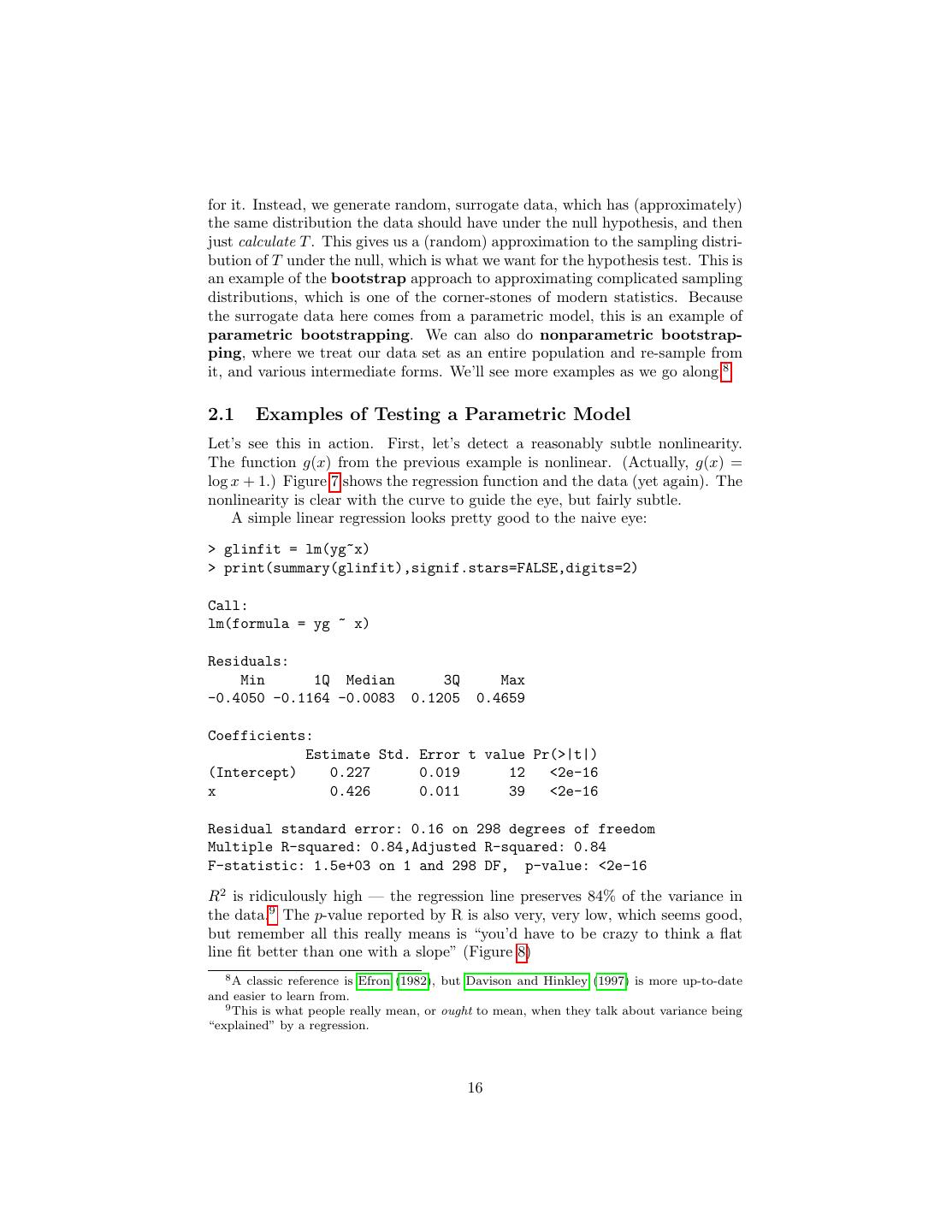 16 .for it. Instead, we generate random, surrogate data, which has (approximately) the same distribution the data should have under the null hypothesis, and then just calculate T . This gives us a (random) approximation to the sampling distri- bution of T under the null, which is what we want for the hypothesis test. This is an example of the bootstrap approach to approximating complicated sampling distributions, which is one of the corner-stones of modern statistics. Because the surrogate data here comes from a parametric model, this is an example of parametric bootstrapping. We can also do nonparametric bootstrap- ping, where we treat our data set as an entire population and re-sample from it, and various intermediate forms. We’ll see more examples as we go along.8 2.1 Examples of Testing a Parametric Model Let’s see this in action. First, let’s detect a reasonably subtle nonlinearity. The function g(x) from the previous example is nonlinear. (Actually, g(x) = log x + 1.) Figure 7 shows the regression function and the data (yet again). The nonlinearity is clear with the curve to guide the eye, but fairly subtle. A simple linear regression looks pretty good to the naive eye: > glinfit = lm(yg~x) > print(summary(glinfit),signif.stars=FALSE,digits=2) Call: lm(formula = yg ~ x) Residuals: Min 1Q Median 3Q Max -0.4050 -0.1164 -0.0083 0.1205 0.4659 Coefficients: Estimate Std. Error t value Pr(>|t|) (Intercept) 0.227 0.019 12 <2e-16 x 0.426 0.011 39 <2e-16 Residual standard error: 0.16 on 298 degrees of freedom Multiple R-squared: 0.84,Adjusted R-squared: 0.84 F-statistic: 1.5e+03 on 1 and 298 DF, p-value: <2e-16 R2 is ridiculously high — the regression line preserves 84% of the variance in the data.9 The p-value reported by R is also very, very low, which seems good, but remember all this really means is “you’d have to be crazy to think a flat line fit better than one with a slope” (Figure 8) 8 A classic reference is Efron (1982), but Davison and Hinkley (1997) is more up-to-date and easier to learn from. 9 This is what people really mean, or ought to mean, when they talk about variance being “explained” by a regression. 16
