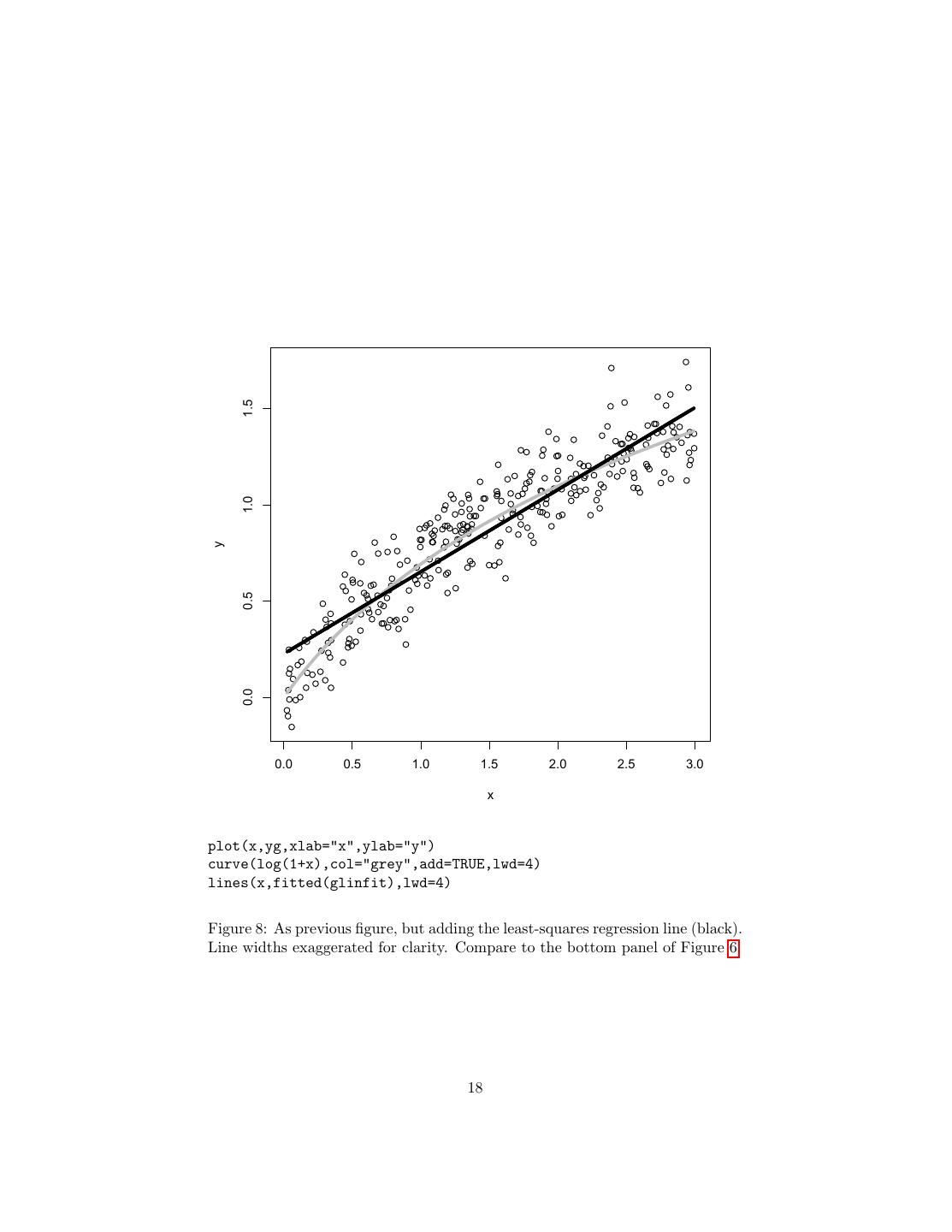 18 . 1.5 1.0 y 0.5 0.0 0.0 0.5 1.0 1.5 2.0 2.5 3.0 x plot(x,yg,xlab="x",ylab="y") curve(log(1+x),col="grey",add=TRUE,lwd=4) lines(x,fitted(glinfit),lwd=4) Figure 8: As previous figure, but adding the least-squares regression line (black). Line widths exaggerated for clarity. Compare to the bottom panel of Figure 6. 18