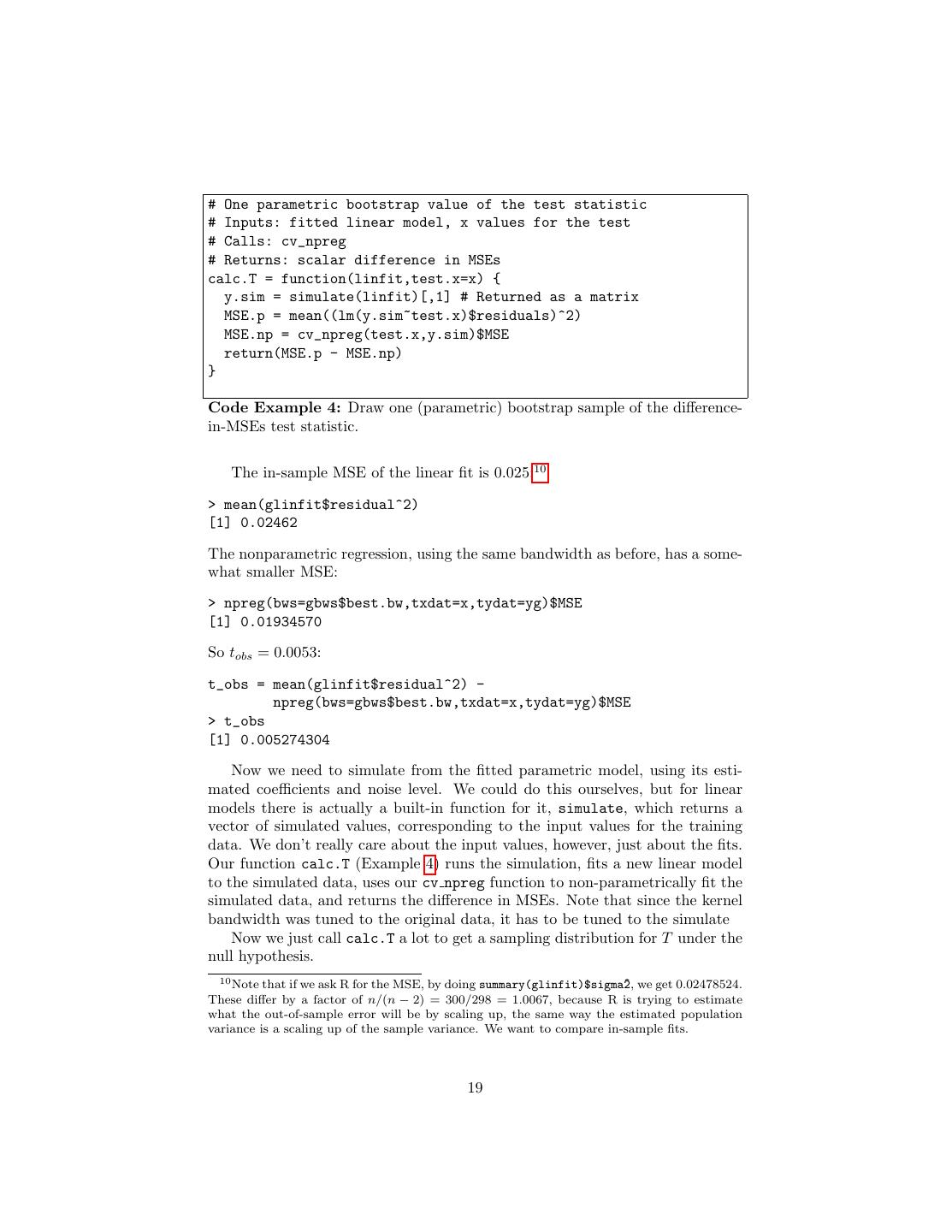 19 .# One parametric bootstrap value of the test statistic # Inputs: fitted linear model, x values for the test # Calls: cv_npreg # Returns: scalar difference in MSEs calc.T = function(linfit,test.x=x) { y.sim = simulate(linfit)[,1] # Returned as a matrix MSE.p = mean((lm(y.sim~test.x)$residuals)^2) MSE.np = cv_npreg(test.x,y.sim)$MSE return(MSE.p - MSE.np) } Code Example 4: Draw one (parametric) bootstrap sample of the difference- in-MSEs test statistic. The in-sample MSE of the linear fit is 0.025:10 > mean(glinfit$residual^2) [1] 0.02462 The nonparametric regression, using the same bandwidth as before, has a some- what smaller MSE: > npreg(bws=gbws$best.bw,txdat=x,tydat=yg)$MSE [1] 0.01934570 So tobs = 0.0053: t_obs = mean(glinfit$residual^2) - npreg(bws=gbws$best.bw,txdat=x,tydat=yg)$MSE > t_obs [1] 0.005274304 Now we need to simulate from the fitted parametric model, using its esti- mated coefficients and noise level. We could do this ourselves, but for linear models there is actually a built-in function for it, simulate, which returns a vector of simulated values, corresponding to the input values for the training data. We don’t really care about the input values, however, just about the fits. Our function calc.T (Example 4) runs the simulation, fits a new linear model to the simulated data, uses our cv npreg function to non-parametrically fit the simulated data, and returns the difference in MSEs. Note that since the kernel bandwidth was tuned to the original data, it has to be tuned to the simulate Now we just call calc.T a lot to get a sampling distribution for T under the null hypothesis. 10 Note that if we ask R for the MSE, by doing summary(glinfit)$sigma^ 2, we get 0.02478524. These differ by a factor of n/(n − 2) = 300/298 = 1.0067, because R is trying to estimate what the out-of-sample error will be by scaling up, the same way the estimated population variance is a scaling up of the sample variance. We want to compare in-sample fits. 19