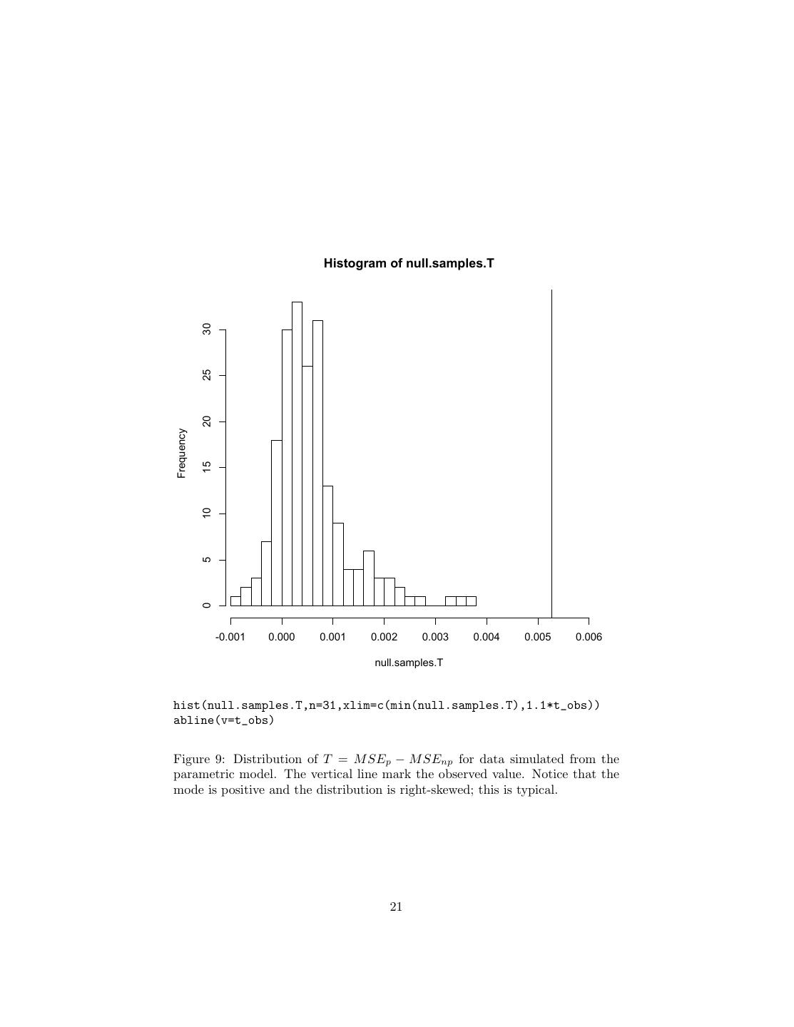 21 . Histogram of null.samples.T 30 25 20 Frequency 15 10 5 0 -0.001 0.000 0.001 0.002 0.003 0.004 0.005 0.006 null.samples.T hist(null.samples.T,n=31,xlim=c(min(null.samples.T),1.1*t_obs)) abline(v=t_obs) Figure 9: Distribution of T = M SEp − M SEnp for data simulated from the parametric model. The vertical line mark the observed value. Notice that the mode is positive and the distribution is right-skewed; this is typical. 21