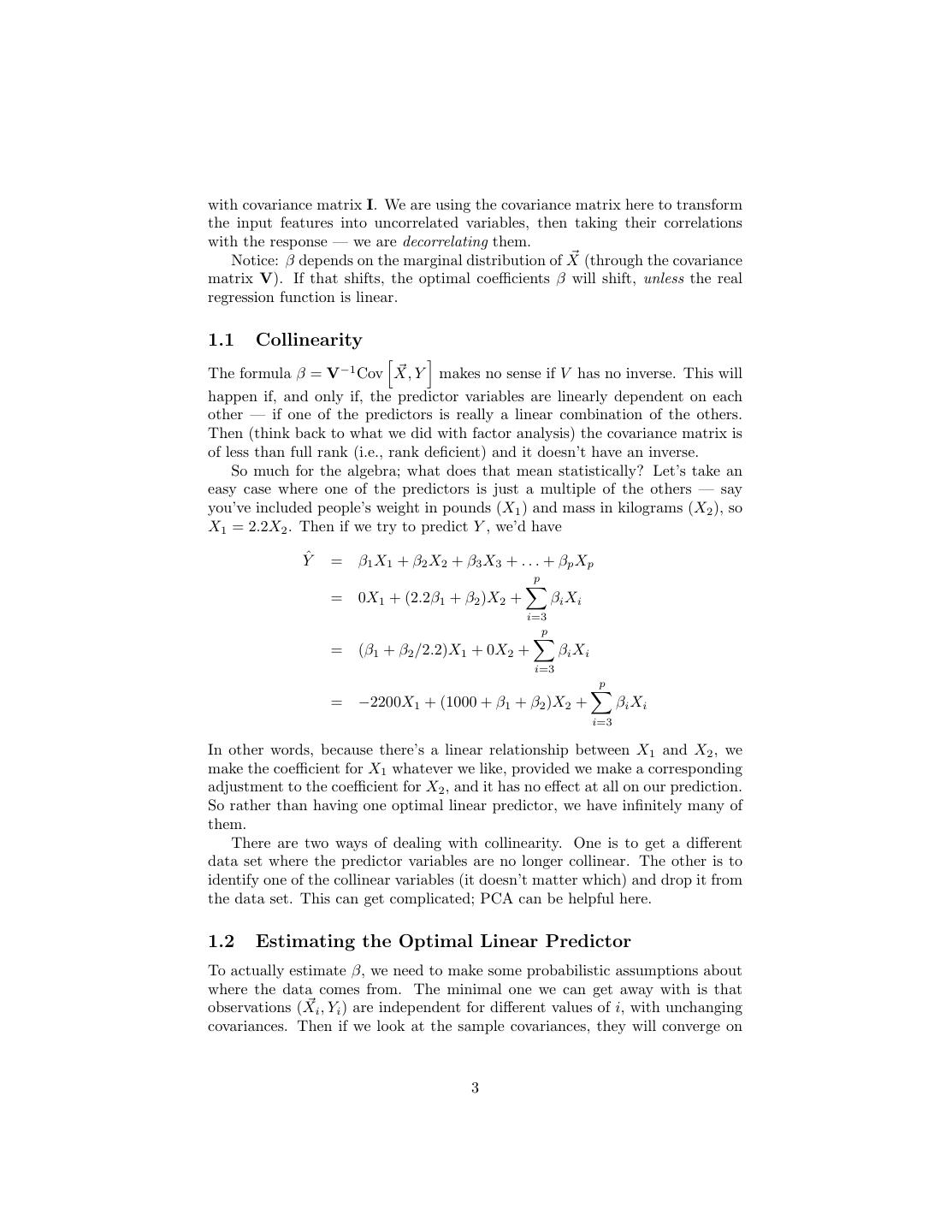 3 .with covariance matrix I. We are using the covariance matrix here to transform the input features into uncorrelated variables, then taking their correlations with the response — we are decorrelating them. Notice: β depends on the marginal distribution of X (through the covariance matrix V). If that shifts, the optimal coefficients β will shift, unless the real regression function is linear. 1.1 Collinearity The formula β = V−1 Cov X, Y makes no sense if V has no inverse. This will happen if, and only if, the predictor variables are linearly dependent on each other — if one of the predictors is really a linear combination of the others. Then (think back to what we did with factor analysis) the covariance matrix is of less than full rank (i.e., rank deficient) and it doesn’t have an inverse. So much for the algebra; what does that mean statistically? Let’s take an easy case where one of the predictors is just a multiple of the others — say you’ve included people’s weight in pounds (X1 ) and mass in kilograms (X2 ), so X1 = 2.2X2 . Then if we try to predict Y , we’d have Yˆ = β1 X1 + β2 X2 + β3 X3 + . . . + βp Xp p = 0X1 + (2.2β1 + β2 )X2 + βi Xi i=3 p = (β1 + β2 /2.2)X1 + 0X2 + βi Xi i=3 p = −2200X1 + (1000 + β1 + β2 )X2 + βi Xi i=3 In other words, because there’s a linear relationship between X1 and X2 , we make the coefficient for X1 whatever we like, provided we make a corresponding adjustment to the coefficient for X2 , and it has no effect at all on our prediction. So rather than having one optimal linear predictor, we have infinitely many of them. There are two ways of dealing with collinearity. One is to get a different data set where the predictor variables are no longer collinear. The other is to identify one of the collinear variables (it doesn’t matter which) and drop it from the data set. This can get complicated; PCA can be helpful here. 1.2 Estimating the Optimal Linear Predictor To actually estimate β, we need to make some probabilistic assumptions about where the data comes from. The minimal one we can get away with is that observations (Xi , Yi ) are independent for different values of i, with unchanging covariances. Then if we look at the sample covariances, they will converge on 3