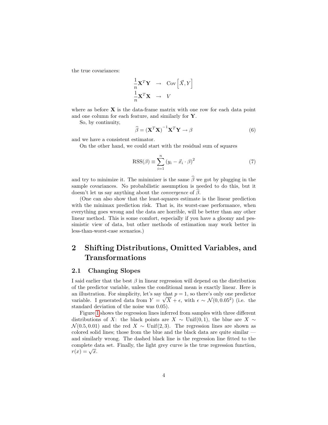4 .the true covariances: 1 T X Y → Cov X, Y n 1 T X X → V n where as before X is the data-frame matrix with one row for each data point and one column for each feature, and similarly for Y. So, by continuity, −1 β = (XT X) XT Y → β (6) and we have a consistent estimator. On the other hand, we could start with the residual sum of squares n 2 RSS(β) ≡ (yi − xi · β) (7) i=1 and try to minimize it. The minimizer is the same β we got by plugging in the sample covariances. No probabilistic assumption is needed to do this, but it doesn’t let us say anything about the convergence of β. (One can also show that the least-squares estimate is the linear prediction with the minimax prediction risk. That is, its worst-case performance, when everything goes wrong and the data are horrible, will be better than any other linear method. This is some comfort, especially if you have a gloomy and pes- simistic view of data, but other methods of estimation may work better in less-than-worst-case scenarios.) 2 Shifting Distributions, Omitted Variables, and Transformations 2.1 Changing Slopes I said earlier that the best β in linear regression will depend on the distribution of the predictor variable, unless the conditional mean is exactly linear. Here is an illustration. For simplicity, let’s say √ that p = 1, so there’s only one predictor variable. I generated data from Y = X + , with ∼ N (0, 0.052 ) (i.e. the standard deviation of the noise was 0.05). Figure 1 shows the regression lines inferred from samples with three different distributions of X: the black points are X ∼ Unif(0, 1), the blue are X ∼ N (0.5, 0.01) and the red X ∼ Unif(2, 3). The regression lines are shown as colored solid lines; those from the blue and the black data are quite similar — and similarly wrong. The dashed black line is the regression line fitted to the complete√ data set. Finally, the light grey curve is the true regression function, r(x) = x. 4