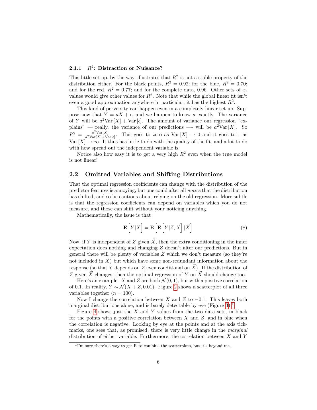 6 .2.1.1 R2 : Distraction or Nuisance? This little set-up, by the way, illustrates that R2 is not a stable property of the distribution either. For the black points, R2 = 0.92; for the blue, R2 = 0.70; and for the red, R2 = 0.77; and for the complete data, 0.96. Other sets of xi values would give other values for R2 . Note that while the global linear fit isn’t even a good approximation anywhere in particular, it has the highest R2 . This kind of perversity can happen even in a completely linear set-up. Sup- pose now that Y = aX + , and we happen to know a exactly. The variance of Y will be a2 Var [X] + Var [ ]. The amount of variance our regression “ex- plains” — really, the variance of our predictions —- will be a2 Var [X]. So a2 Var[X] R2 = a2 Var[X]+Var[ ] . This goes to zero as Var [X] → 0 and it goes to 1 as Var [X] → ∞. It thus has little to do with the quality of the fit, and a lot to do with how spread out the independent variable is. Notice also how easy it is to get a very high R2 even when the true model is not linear! 2.2 Omitted Variables and Shifting Distributions That the optimal regression coefficients can change with the distribution of the predictor features is annoying, but one could after all notice that the distribution has shifted, and so be cautious about relying on the old regression. More subtle is that the regression coefficients can depend on variables which you do not measure, and those can shift without your noticing anything. Mathematically, the issue is that E Y |X = E E Y |Z, X |X (8) Now, if Y is independent of Z given X, then the extra conditioning in the inner expectation does nothing and changing Z doesn’t alter our predictions. But in general there will be plenty of variables Z which we don’t measure (so they’re not included in X) but which have some non-redundant information about the response (so that Y depends on Z even conditional on X). If the distribution of Z given X changes, then the optimal regression of Y on X should change too. Here’s an example. X and Z are both N (0, 1), but with a positive correlation of 0.1. In reality, Y ∼ N (X + Z, 0.01). Figure 2 shows a scatterplot of all three variables together (n = 100). Now I change the correlation between X and Z to −0.1. This leaves both marginal distributions alone, and is barely detectable by eye (Figure 3).1 Figure 4 shows just the X and Y values from the two data sets, in black for the points with a positive correlation between X and Z, and in blue when the correlation is negative. Looking by eye at the points and at the axis tick- marks, one sees that, as promised, there is very little change in the marginal distribution of either variable. Furthermore, the correlation between X and Y 1 I’m sure there’s a way to get R to combine the scatterplots, but it’s beyond me. 6