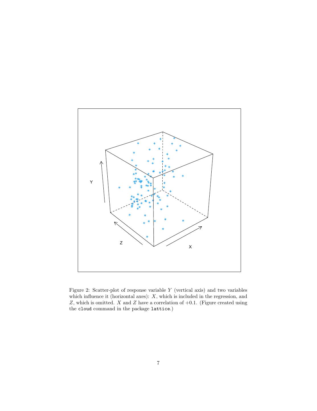 7 . Y Z X Figure 2: Scatter-plot of response variable Y (vertical axis) and two variables which influence it (horizontal axes): X, which is included in the regression, and Z, which is omitted. X and Z have a correlation of +0.1. (Figure created using the cloud command in the package lattice.) 7
