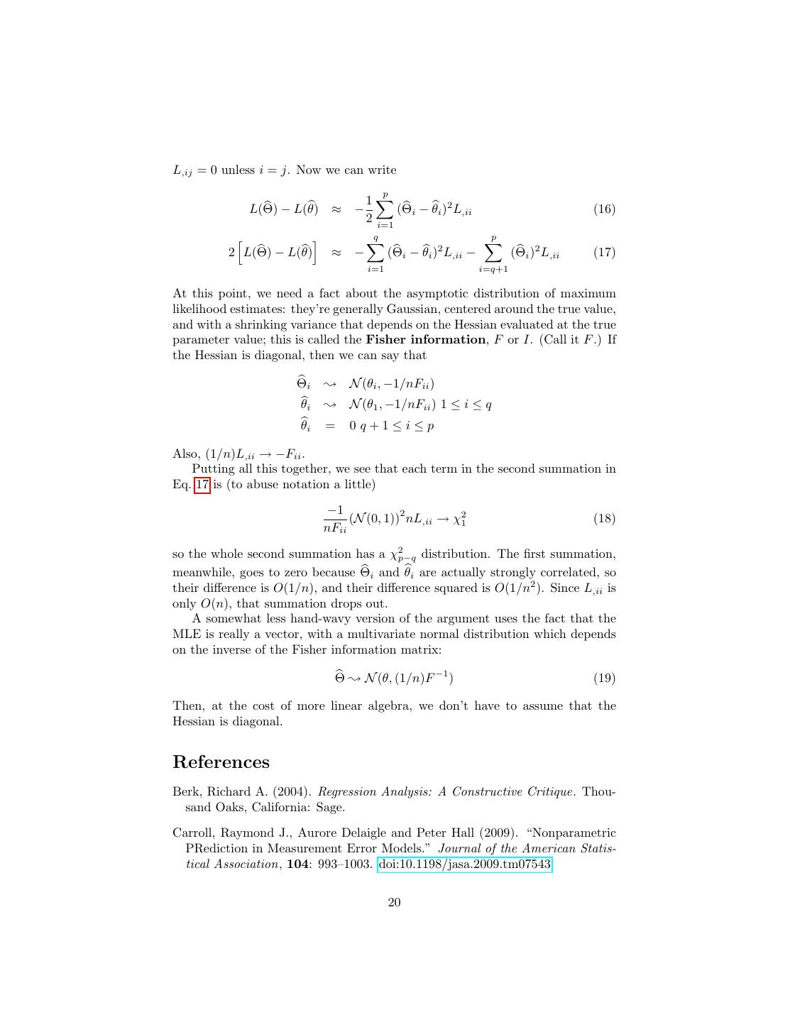 20 .L,ij = 0 unless i = j. Now we can write p 1 L(Θ) − L(θ) ≈ − (Θi − θi )2 L,ii (16) 2 i=1 q p 2 L(Θ) − L(θ) ≈ − (Θi − θi )2 L,ii − (Θi )2 L,ii (17) i=1 i=q+1 At this point, we need a fact about the asymptotic distribution of maximum likelihood estimates: they’re generally Gaussian, centered around the true value, and with a shrinking variance that depends on the Hessian evaluated at the true parameter value; this is called the Fisher information, F or I. (Call it F .) If the Hessian is diagonal, then we can say that Θi ❀ N (θi , −1/nFii ) θi ❀ N (θ1 , −1/nFii ) 1 ≤ i ≤ q θi = 0 q+1≤i≤p Also, (1/n)L,ii → −Fii . Putting all this together, we see that each term in the second summation in Eq. 17 is (to abuse notation a little) −1 2 (N (0, 1)) nL,ii → χ21 (18) nFii so the whole second summation has a χ2p−q distribution. The first summation, meanwhile, goes to zero because Θi and θi are actually strongly correlated, so their difference is O(1/n), and their difference squared is O(1/n2 ). Since L,ii is only O(n), that summation drops out. A somewhat less hand-wavy version of the argument uses the fact that the MLE is really a vector, with a multivariate normal distribution which depends on the inverse of the Fisher information matrix: Θ ❀ N (θ, (1/n)F −1 ) (19) Then, at the cost of more linear algebra, we don’t have to assume that the Hessian is diagonal. References Berk, Richard A. (2004). Regression Analysis: A Constructive Critique. Thou- sand Oaks, California: Sage. Carroll, Raymond J., Aurore Delaigle and Peter Hall (2009). “Nonparametric PRediction in Measurement Error Models.” Journal of the American Statis- tical Association, 104: 993–1003. doi:10.1198/jasa.2009.tm07543. 20