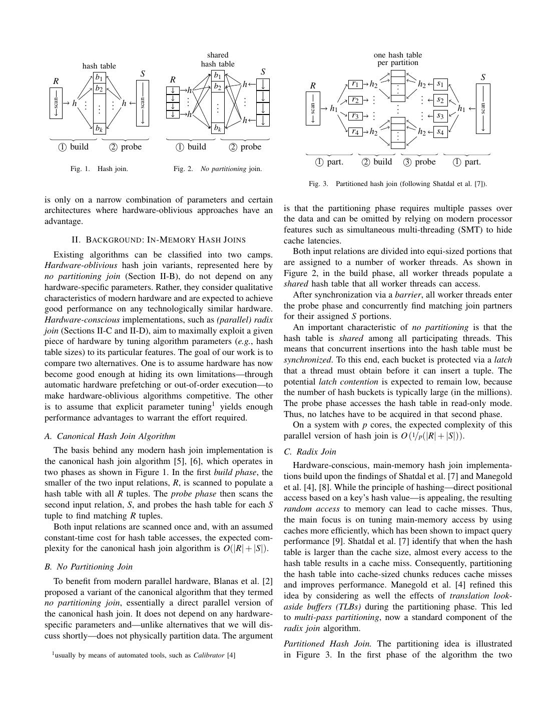1 . Main-Memory Hash Joins on Multi-Core CPUs: Tuning to the Underlying Hardware ¨ Cagri Balkesen #1 , Jens Teubner #2 , Gustavo Alonso #3 , M. Tamer Ozsu ∗4 # Systems Group, Department of Computer Science, ETH Zurich, Switzerland 1, 2, 3 {name.surname}@inf.ethz.ch ∗ University of Waterloo, Canada 4 tamer.ozsu@uwaterloo.ca Abstract—The architectural changes introduced with multi- hides the performance loss inherent in multi-layer memory core CPUs have triggered a redesign of main-memory join hierarchy. In addition, so the argument goes, fine tuning of algorithms. In the last few years, two diverging views have the algorithms to specific hardware makes them less portable appeared. One approach advocates careful tailoring of the algorithm to the architectural parameters (cache sizes, TLB, and and less robust to, e.g., data skew. memory bandwidth). The other approach argues that modern A third line of thought claims that sort-merge join is already hardware is good enough at hiding cache and TLB miss latencies better than hash join and can be efficiently implemented and, consequently, the careful tailoring can be omitted without without using SIMD [3]. These results contradict the claims of sacrificing performance. both Blanas et al. [2] because they are based on careful tuning In this paper we demonstrate through experimental analysis of different algorithms and architectures that hardware still to the hardware (in this case to its non-uniform memory access matters. Join algorithms that are hardware conscious perform characteristics) as well as the claims of Kim et al. [1] regarding better than hardware-oblivious approaches. The analysis and the behavior of sort-merge vs. hashing when using SIMD. comparisons in the paper show that many of the claims regarding For reasons of space, in this paper we focus on the question the behavior of join algorithms that have appeared in literature of whether it is important to tune the main-memory hash join are due to selection effects (relative table sizes, tuple sizes, the underlying architecture, using sorted data, etc.) and are to the underlying hardware as claimed explicitly by [1] and not supported by experiments run under different parameters implicitly by [3]. We also focus on radix join algorithms and settings. Through the analysis, we shed light on how modern leave the comparison with sort-merge joins for future work. hardware affects the implementation of data operators and Answering the question of whether hardware still matters is provide the fastest implementation of radix join to date, reaching a complex task because of the intricacies of modern hardware close to 200 million tuples per second. and the many possibilities available when implementing and tuning main-memory joins. To make matters worse, there are I. I NTRODUCTION many parameters that affect the behavior of join operators: Modern processors provide parallelism at various levels: relative table sizes, use of SIMD, page sizes, TLB sizes, instruction parallelism via super scalar execution; data-level structure of the tables and organization, hardware architecture, parallelism by extended support for single instruction over tuning of the implementation, etc. Existing studies share very multiple data (SIMD; i.e., SSE, 128-bits; AVX, 256-bits); and few points in common in terms of the space explored, making thread-level parallelism through multiple cores and simulta- it difficult to compare their claims. As shown in the paper, neous multi-threading (SMT). Such changes are triggering a many of these claims are specific to the choice of certain profound redesign of main-memory join algorithms. However, parameters and architectures and cannot be generalized. the landscape that has emerged so far is rather inconclusive. The first contribution of the paper is algorithmic. We One line of argument maintains that main-memory parallel analyze the algorithms proposed in the literature and propose joins should be hardware-conscious: the best performance can several important optimizations leading to new algorithms that only be achieved by fine tuning the algorithm to the underlying are more efficient and robust to parameter changes. In doing architecture [1]. These results also show that SIMD is still not so, we provide important insights on the effects of multi-core good enough to tip the decision on join algorithm towards hardware on algorithm design. sort-merge join instead of the more commonly used hash join. The second contribution is to put existing claims into con- In the future, however, as SIMD becomes wider, sort-merge text, showing what choice of parameters or hardware features join is likely to perform better. cause the observed behaviors. These results shed light on Another line of argument suggests that join algorithms what parameters play a role in multi-core systems, thereby can be made efficient while remaining hardware-oblivious establishing the basis for the choices a query optimizer for [2]. That is, there is no need for tuning—particularly of the multi-core will need to make. The third and final contribution partition phase of a join where data is carefully arranged to is to settle the issue of whether tuning to the underlying fit into the corresponding caches—because modern hardware hardware plays a role. The answer is a definitive yes, as it