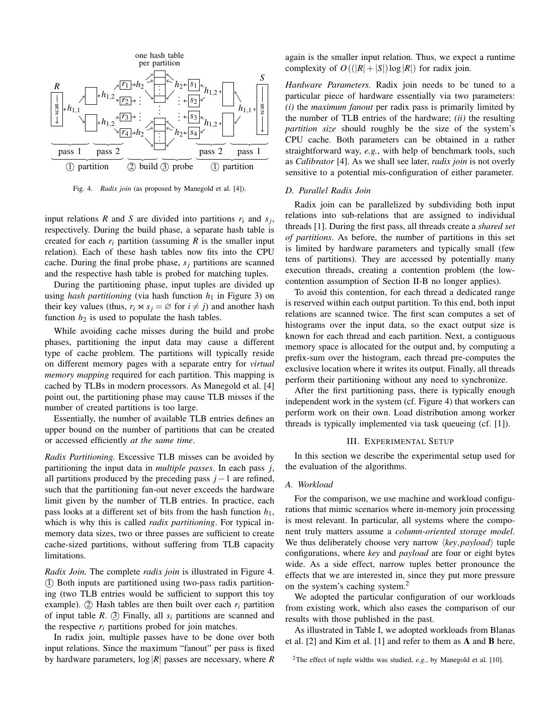 3 . one hash table again is the smaller input relation. Thus, we expect a runtime per partition complexity of O ((|R| + |S|) log |R|) for radix join. S R r1 h2 .. h2 s1 Hardware Parameters. Radix join needs to be tuned to a h1,2 . . .. h1,2 r2 .. particular piece of hardware essentially via two parameters: .. . s2 scan scan h1,1 . . .. h1,1 (i) the maximum fanout per radix pass is primarily limited by r3 .. . s3 h the number of TLB entries of the hardware; (ii) the resulting h1,2 1,2 r4 h2 .. h2 s4 partition size should roughly be the size of the system’s . CPU cache. Both parameters can be obtained in a rather pass 1 pass 2 pass 2 pass 1 straightforward way, e.g., with help of benchmark tools, such as Calibrator [4]. As we shall see later, radix join is not overly 1 partition 2 build 3 probe 1 partition sensitive to a potential mis-configuration of either parameter. Fig. 4. Radix join (as proposed by Manegold et al. [4]). D. Parallel Radix Join Radix join can be parallelized by subdividing both input input relations R and S are divided into partitions ri and s j , relations into sub-relations that are assigned to individual respectively. During the build phase, a separate hash table is threads [1]. During the first pass, all threads create a shared set created for each ri partition (assuming R is the smaller input of partitions. As before, the number of partitions in this set relation). Each of these hash tables now fits into the CPU is limited by hardware parameters and typically small (few cache. During the final probe phase, s j partitions are scanned tens of partitions). They are accessed by potentially many and the respective hash table is probed for matching tuples. execution threads, creating a contention problem (the low- During the partitioning phase, input tuples are divided up contention assumption of Section II-B no longer applies). using hash partitioning (via hash function h1 in Figure 3) on To avoid this contention, for each thread a dedicated range their key values (thus, ri s j = ∅ for i = j) and another hash is reserved within each output partition. To this end, both input function h2 is used to populate the hash tables. relations are scanned twice. The first scan computes a set of histograms over the input data, so the exact output size is While avoiding cache misses during the build and probe known for each thread and each partition. Next, a contiguous phases, partitioning the input data may cause a different memory space is allocated for the output and, by computing a type of cache problem. The partitions will typically reside prefix-sum over the histogram, each thread pre-computes the on different memory pages with a separate entry for virtual exclusive location where it writes its output. Finally, all threads memory mapping required for each partition. This mapping is perform their partitioning without any need to synchronize. cached by TLBs in modern processors. As Manegold et al. [4] After the first partitioning pass, there is typically enough point out, the partitioning phase may cause TLB misses if the independent work in the system (cf. Figure 4) that workers can number of created partitions is too large. perform work on their own. Load distribution among worker Essentially, the number of available TLB entries defines an threads is typically implemented via task queueing (cf. [1]). upper bound on the number of partitions that can be created or accessed efficiently at the same time. III. E XPERIMENTAL S ETUP Radix Partitioning. Excessive TLB misses can be avoided by In this section we describe the experimental setup used for partitioning the input data in multiple passes. In each pass j, the evaluation of the algorithms. all partitions produced by the preceding pass j − 1 are refined, A. Workload such that the partitioning fan-out never exceeds the hardware limit given by the number of TLB entries. In practice, each For the comparison, we use machine and workload configu- pass looks at a different set of bits from the hash function h1 , rations that mimic scenarios where in-memory join processing which is why this is called radix partitioning. For typical in- is most relevant. In particular, all systems where the compo- memory data sizes, two or three passes are sufficient to create nent truly matters assume a column-oriented storage model. cache-sized partitions, without suffering from TLB capacity We thus deliberately choose very narrow key, payload tuple limitations. configurations, where key and payload are four or eight bytes wide. As a side effect, narrow tuples better pronounce the Radix Join. The complete radix join is illustrated in Figure 4. effects that we are interested in, since they put more pressure 1 Both inputs are partitioned using two-pass radix partition- on the system’s caching system.2 ing (two TLB entries would be sufficient to support this toy We adopted the particular configuration of our workloads example). 2 Hash tables are then built over each ri partition from existing work, which also eases the comparison of our of input table R. 3 Finally, all si partitions are scanned and results with those published in the past. the respective ri partitions probed for join matches. As illustrated in Table I, we adopted workloads from Blanas In radix join, multiple passes have to be done over both et al. [2] and Kim et al. [1] and refer to them as A and B here, input relations. Since the maximum “fanout” per pass is fixed by hardware parameters, log |R| passes are necessary, where R 2 The effect of tuple widths was studied, e.g., by Manegold et al. [10].