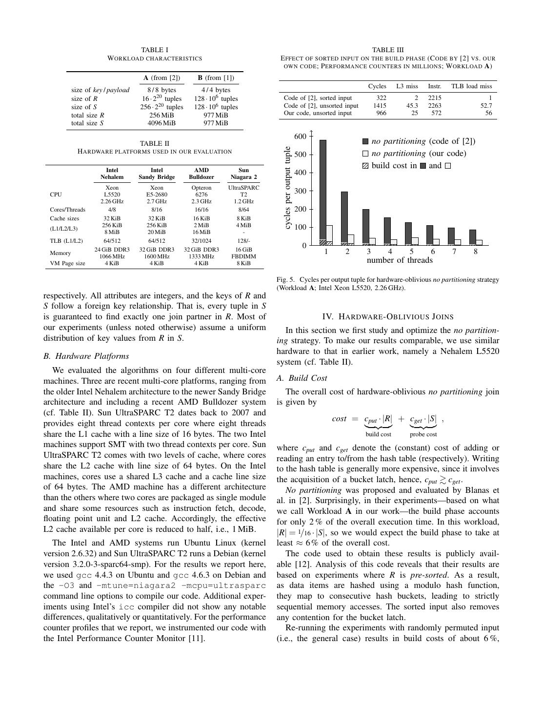 4 . TABLE I TABLE III W ORKLOAD CHARACTERISTICS E FFECT OF SORTED INPUT ON THE BUILD PHASE (C ODE BY [2] VS . OUR OWN CODE ; P ERFORMANCE COUNTERS IN MILLIONS ; W ORKLOAD A) A (from [2]) B (from [1]) Cycles L3 miss Instr. TLB load miss size of key / payload 8 / 8 bytes 4 / 4 bytes size of R 16 · 220 tuples 128 · 106 tuples Code of [2], sorted input 322 2 2215 1 size of S 256 · 220 tuples 128 · 106 tuples Code of [2], unsorted input 1415 45.3 2263 52.7 total size R 256 MiB 977 MiB Our code, unsorted input 966 25 572 56 total size S 4096 MiB 977 MiB 600 TABLE II no partitioning (code of [2]) cycles per output tuple H ARDWARE PLATFORMS USED IN OUR EVALUATION 500 no partitioning (our code) Intel Intel AMD Sun build cost in and Nehalem Sandy Bridge Bulldozer Niagara 2 400 Xeon Xeon Opteron UltraSPARC CPU L5520 E5-2680 6276 T2 300 2.26 GHz 2.7 GHz 2.3 GHz 1.2 GHz Cores/Threads 4/8 8/16 16/16 8/64 200 Cache sizes 32 KiB 32 KiB 16 KiB 8 KiB 256 KiB 256 KiB 2 MiB 4 MiB 100 (L1/L2/L3) 8 MiB 20 MiB 16 MiB - TLB (L1/L2) 64/512 64/512 32/1024 128/- 24 GiB DDR3 32 GiB DDR3 32 GiB DDR3 16 GiB 0 Memory 1 2 3 4 5 6 7 8 1066 MHz 1600 MHz 1333 MHz FBDIMM VM Page size 4 KiB 4 KiB 4 KiB 8 KiB number of threads Fig. 5. Cycles per output tuple for hardware-oblivious no partitioning strategy (Workload A; Intel Xeon L5520, 2.26 GHz). respectively. All attributes are integers, and the keys of R and S follow a foreign key relationship. That is, every tuple in S is guaranteed to find exactly one join partner in R. Most of IV. H ARDWARE -O BLIVIOUS J OINS our experiments (unless noted otherwise) assume a uniform In this section we first study and optimize the no partition- distribution of key values from R in S. ing strategy. To make our results comparable, we use similar hardware to that in earlier work, namely a Nehalem L5520 B. Hardware Platforms system (cf. Table II). We evaluated the algorithms on four different multi-core machines. Three are recent multi-core platforms, ranging from A. Build Cost the older Intel Nehalem architecture to the newer Sandy Bridge The overall cost of hardware-oblivious no partitioning join architecture and including a recent AMD Bulldozer system is given by (cf. Table II). Sun UltraSPARC T2 dates back to 2007 and cost = cput · |R| + cget · |S| , provides eight thread contexts per core where eight threads share the L1 cache with a line size of 16 bytes. The two Intel build cost probe cost machines support SMT with two thread contexts per core. Sun where cput and cget denote the (constant) cost of adding or UltraSPARC T2 comes with two levels of cache, where cores reading an entry to/from the hash table (respectively). Writing share the L2 cache with line size of 64 bytes. On the Intel to the hash table is generally more expensive, since it involves machines, cores use a shared L3 cache and a cache line size the acquisition of a bucket latch, hence, cput cget . of 64 bytes. The AMD machine has a different architecture No partitioning was proposed and evaluated by Blanas et than the others where two cores are packaged as single module al. in [2]. Surprisingly, in their experiments—based on what and share some resources such as instruction fetch, decode, we call Workload A in our work—the build phase accounts floating point unit and L2 cache. Accordingly, the effective for only 2 % of the overall execution time. In this workload, L2 cache available per core is reduced to half, i.e., 1 MiB. |R| = 1/16 · |S|, so we would expect the build phase to take at The Intel and AMD systems run Ubuntu Linux (kernel least ≈ 6 % of the overall cost. version 2.6.32) and Sun UltraSPARC T2 runs a Debian (kernel The code used to obtain these results is publicly avail- version 3.2.0-3-sparc64-smp). For the results we report here, able [12]. Analysis of this code reveals that their results are we used gcc 4.4.3 on Ubuntu and gcc 4.6.3 on Debian and based on experiments where R is pre-sorted. As a result, the -O3 and -mtune=niagara2 -mcpu=ultrasparc as data items are hashed using a modulo hash function, command line options to compile our code. Additional exper- they map to consecutive hash buckets, leading to strictly iments using Intel’s icc compiler did not show any notable sequential memory accesses. The sorted input also removes differences, qualitatively or quantitatively. For the performance any contention for the bucket latch. counter profiles that we report, we instrumented our code with Re-running the experiments with randomly permuted input the Intel Performance Counter Monitor [11]. (i.e., the general case) results in build costs of about 6 %,