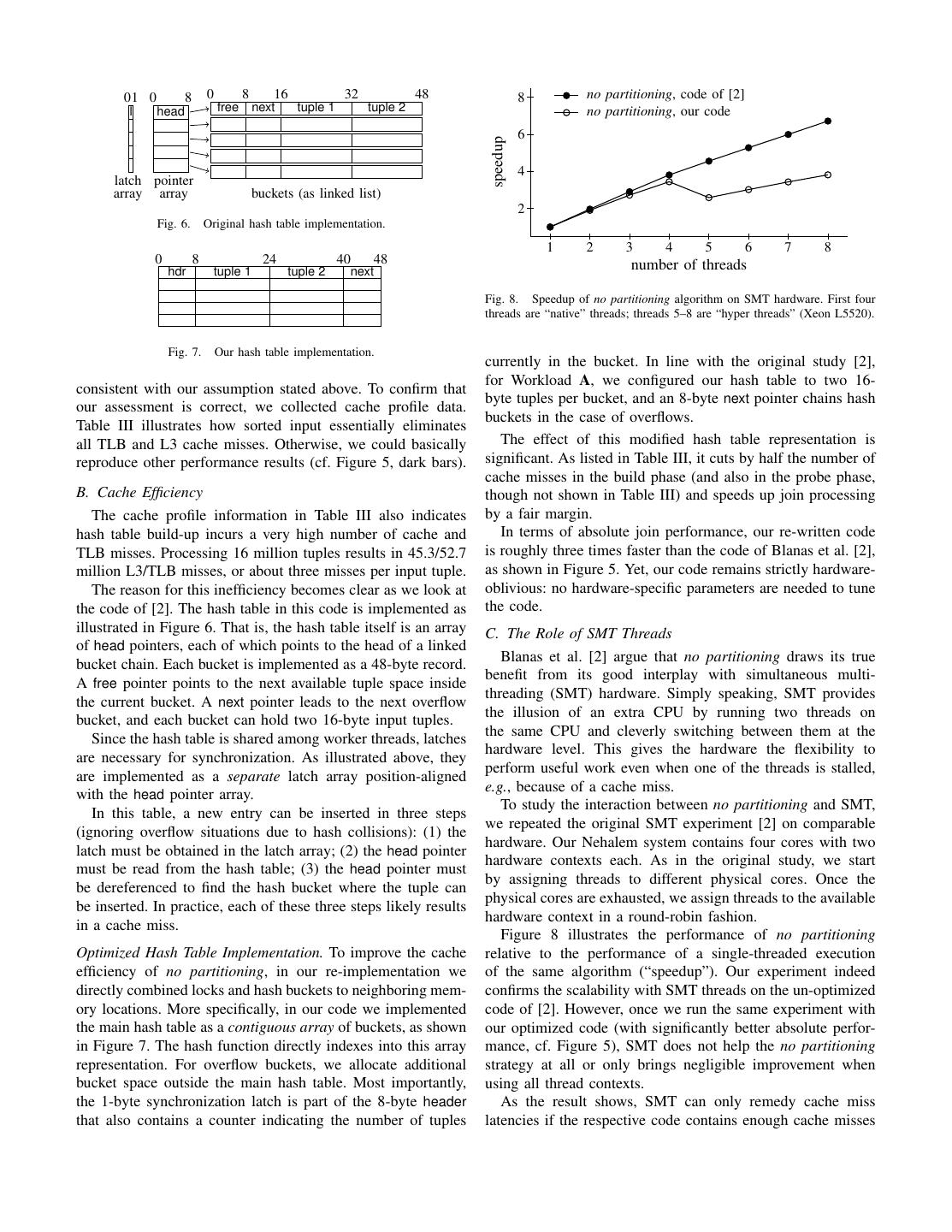 5 . 01 0 8 0 8 16 32 48 8 no partitioning, code of [2] l head free next tuple 1 tuple 2 no partitioning, our code 6 speedup 4 latch pointer array array buckets (as linked list) 2 Fig. 6. Original hash table implementation. 1 2 3 4 5 6 7 8 0 8 24 40 48 number of threads hdr tuple 1 tuple 2 next Fig. 8. Speedup of no partitioning algorithm on SMT hardware. First four threads are “native” threads; threads 5–8 are “hyper threads” (Xeon L5520). Fig. 7. Our hash table implementation. currently in the bucket. In line with the original study [2], for Workload A, we configured our hash table to two 16- consistent with our assumption stated above. To confirm that byte tuples per bucket, and an 8-byte next pointer chains hash our assessment is correct, we collected cache profile data. buckets in the case of overflows. Table III illustrates how sorted input essentially eliminates all TLB and L3 cache misses. Otherwise, we could basically The effect of this modified hash table representation is reproduce other performance results (cf. Figure 5, dark bars). significant. As listed in Table III, it cuts by half the number of cache misses in the build phase (and also in the probe phase, B. Cache Efficiency though not shown in Table III) and speeds up join processing The cache profile information in Table III also indicates by a fair margin. hash table build-up incurs a very high number of cache and In terms of absolute join performance, our re-written code TLB misses. Processing 16 million tuples results in 45.3/52.7 is roughly three times faster than the code of Blanas et al. [2], million L3/TLB misses, or about three misses per input tuple. as shown in Figure 5. Yet, our code remains strictly hardware- The reason for this inefficiency becomes clear as we look at oblivious: no hardware-specific parameters are needed to tune the code of [2]. The hash table in this code is implemented as the code. illustrated in Figure 6. That is, the hash table itself is an array C. The Role of SMT Threads of head pointers, each of which points to the head of a linked Blanas et al. [2] argue that no partitioning draws its true bucket chain. Each bucket is implemented as a 48-byte record. benefit from its good interplay with simultaneous multi- A free pointer points to the next available tuple space inside threading (SMT) hardware. Simply speaking, SMT provides the current bucket. A next pointer leads to the next overflow the illusion of an extra CPU by running two threads on bucket, and each bucket can hold two 16-byte input tuples. the same CPU and cleverly switching between them at the Since the hash table is shared among worker threads, latches hardware level. This gives the hardware the flexibility to are necessary for synchronization. As illustrated above, they perform useful work even when one of the threads is stalled, are implemented as a separate latch array position-aligned e.g., because of a cache miss. with the head pointer array. To study the interaction between no partitioning and SMT, In this table, a new entry can be inserted in three steps we repeated the original SMT experiment [2] on comparable (ignoring overflow situations due to hash collisions): (1) the hardware. Our Nehalem system contains four cores with two latch must be obtained in the latch array; (2) the head pointer hardware contexts each. As in the original study, we start must be read from the hash table; (3) the head pointer must by assigning threads to different physical cores. Once the be dereferenced to find the hash bucket where the tuple can physical cores are exhausted, we assign threads to the available be inserted. In practice, each of these three steps likely results hardware context in a round-robin fashion. in a cache miss. Figure 8 illustrates the performance of no partitioning Optimized Hash Table Implementation. To improve the cache relative to the performance of a single-threaded execution efficiency of no partitioning, in our re-implementation we of the same algorithm (“speedup”). Our experiment indeed directly combined locks and hash buckets to neighboring mem- confirms the scalability with SMT threads on the un-optimized ory locations. More specifically, in our code we implemented code of [2]. However, once we run the same experiment with the main hash table as a contiguous array of buckets, as shown our optimized code (with significantly better absolute perfor- in Figure 7. The hash function directly indexes into this array mance, cf. Figure 5), SMT does not help the no partitioning representation. For overflow buckets, we allocate additional strategy at all or only brings negligible improvement when bucket space outside the main hash table. Most importantly, using all thread contexts. the 1-byte synchronization latch is part of the 8-byte header As the result shows, SMT can only remedy cache miss that also contains a counter indicating the number of tuples latencies if the respective code contains enough cache misses