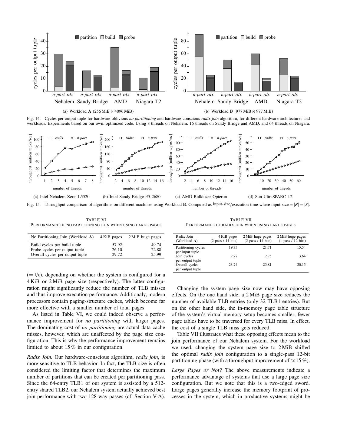 9 . cycles per output tuple partition build probe partition build probe cycles per output tuple 40 80 30 60 20 40 10 20 0 0 n-part rdx n-part rdx n-part rdx n-part rdx n-part rdx n-part rdx n-part rdx n-part rdx Nehalem Sandy Bridge AMD Niagara T2 Nehalem Sandy Bridge AMD Niagara T2 (a) Workload A (256 MiB 4096 MiB) (b) Workload B (977 MiB 977 MiB) Fig. 14. Cycles per output tuple for hardware-oblivious no partitioning and hardware-conscious radix join algorithm, for different hardware architectures and workloads. Experiments based on our own, optimized code. Using 8 threads on Nehalem, 16 threads on Sandy Bridge and AMD, and 64 threads on Niagara. throughput [million tuples/sec] throughput [million tuples/sec] throughput [million tuples/sec] throughput [million tuples/sec] radix n-part radix n-part radix n-part radix n-part 100 200 100 50 80 160 80 40 60 120 60 30 40 80 40 20 20 40 20 10 0 0 0 0 1 2 3 4 5 6 7 8 2 4 6 8 10 12 14 16 2 4 6 8 10 12 14 16 10 20 30 40 50 60 number of threads number of threads number of threads number of threads (a) Intel Nehalem Xeon L5520 (b) Intel Sandy Bridge E5-2680 (c) AMD Bulldozer Opteron (d) Sun UltraSPARC T2 Fig. 15. Throughput comparison of algorithms on different machines using Workload B. Computed as input-size/execution-time where input-size = |R| = |S|. TABLE VI TABLE VII P ERFORMANCE OF NO PARTITIONING JOIN WHEN USING LARGE PAGES P ERFORMANCE OF RADIX JOIN WHEN USING LARGE PAGES No Partitioning Join (Workload A) 4 KiB pages 2 MiB huge pages Radix Join 4 KiB pages 2 MiB huge pages 2 MiB huge pages (Workload A) (2 pass / 14 bits) (2 pass / 14 bits) (1 pass / 12 bits) Build cycles per build tuple 57.92 49.74 Partitioning cycles 19.73 21.71 15.54 Probe cycles per output tuple 26.10 22.88 per input tuple Overall cycles per output tuple 29.72 25.99 Join cycles 2.77 2.75 3.64 per output tuple Overall cycles 23.74 25.81 20.15 per output tuple (= 1/6), depending on whether the system is configured for a 4 KiB or 2 MiB page size (respectively). The latter configu- ration might significantly reduce the number of TLB misses Changing the system page size now may have opposing and thus improve execution performance. Additionaly, modern effects. On the one hand side, a 2 MiB page size reduces the processors contain paging-structure caches, which become far number of available TLB entries (only 32 TLB1 entries). But more effective with a smaller number of total pages. on the other hand side, the in-memory page table structure As listed in Table VI, we could indeed observe a perfor- of the system’s virtual memory setup becomes smaller; fewer mance improvement for no partitioning with larger pages. page tables have to be traversed for every TLB miss. In effect, The dominating cost of no partitioning are actual data cache the cost of a single TLB miss gets reduced. misses, however, which are unaffected by the page size con- Table VII illustrates what these opposing effects mean to the figuration. This is why the performance improvement remains join performance of our Nehalem system. For the workload limited to about 15 % in our configuration. we used, changing the system page size to 2 MiB shifted the optimal radix join configuration to a single-pass 12-bit Radix Join. Our hardware-conscious algorithm, radix join, is partitioning phase (with a throughput improvement of ≈ 15 %). more sensitive to TLB behavior. In fact, the TLB size is often considered the limiting factor that determines the maximum Large Pages or Not? The above measurements indicate a number of partitions that can be created per partitioning pass. performance advantage of systems that use a large page size Since the 64-entry TLB1 of our system is assisted by a 512- configuration. But we note that this is a two-edged sword. entry shared TLB2, our Nehalem system actually achieved best Large pages generally increase the memory footprint of pro- join performance with two 128-way passes (cf. Section V-A). cesses in the system, which in productive systems might be