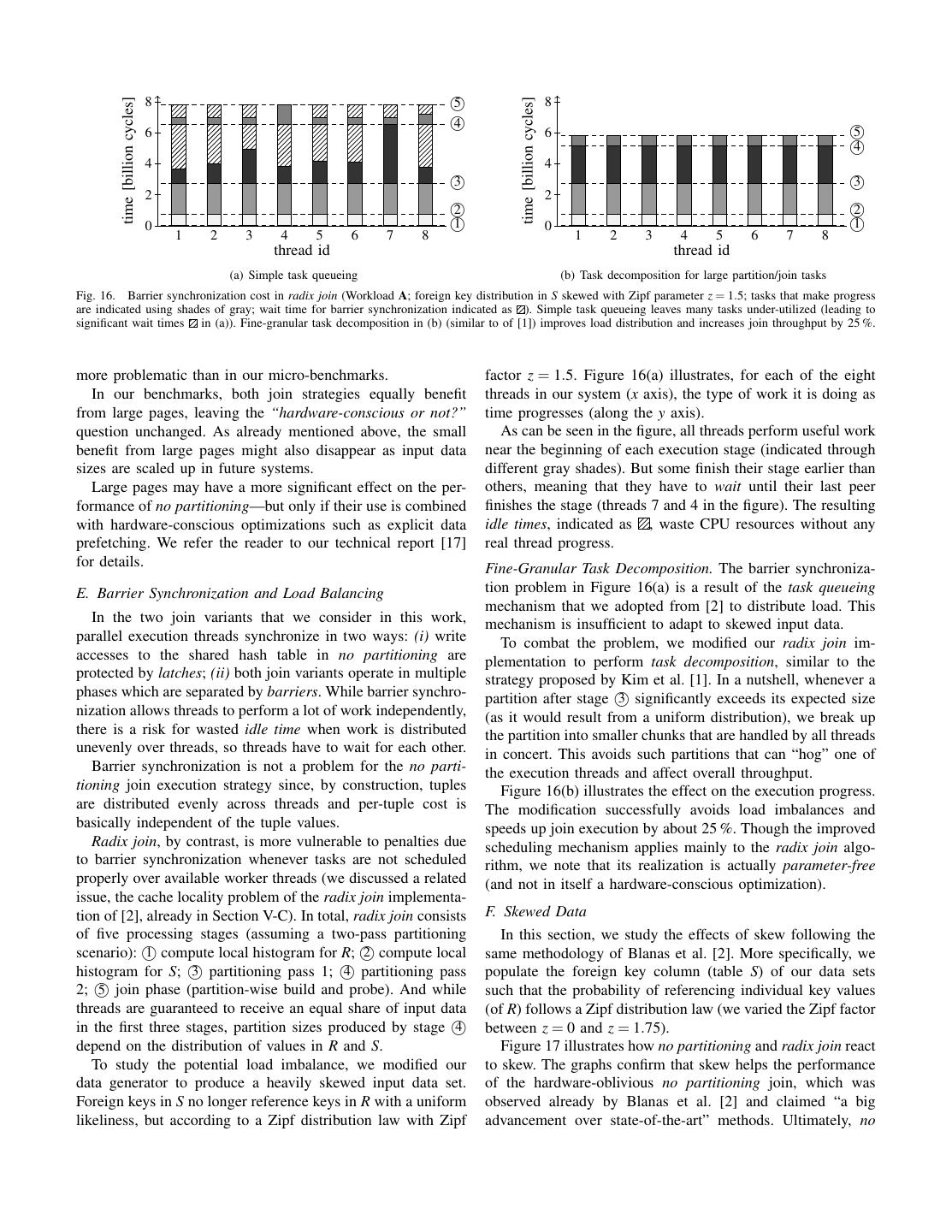 10 . time [billion cycles] time [billion cycles] 8 5 8 4 6 6 5 4 4 4 3 3 2 2 2 2 0 1 0 1 1 2 3 4 5 6 7 8 1 2 3 4 5 6 7 8 thread id thread id (a) Simple task queueing (b) Task decomposition for large partition/join tasks Fig. 16. Barrier synchronization cost in radix join (Workload A; foreign key distribution in S skewed with Zipf parameter z = 1.5; tasks that make progress are indicated using shades of gray; wait time for barrier synchronization indicated as ). Simple task queueing leaves many tasks under-utilized (leading to significant wait times in (a)). Fine-granular task decomposition in (b) (similar to of [1]) improves load distribution and increases join throughput by 25 %. more problematic than in our micro-benchmarks. factor z = 1.5. Figure 16(a) illustrates, for each of the eight In our benchmarks, both join strategies equally benefit threads in our system (x axis), the type of work it is doing as from large pages, leaving the “hardware-conscious or not?” time progresses (along the y axis). question unchanged. As already mentioned above, the small As can be seen in the figure, all threads perform useful work benefit from large pages might also disappear as input data near the beginning of each execution stage (indicated through sizes are scaled up in future systems. different gray shades). But some finish their stage earlier than Large pages may have a more significant effect on the per- others, meaning that they have to wait until their last peer formance of no partitioning—but only if their use is combined finishes the stage (threads 7 and 4 in the figure). The resulting with hardware-conscious optimizations such as explicit data idle times, indicated as , waste CPU resources without any prefetching. We refer the reader to our technical report [17] real thread progress. for details. Fine-Granular Task Decomposition. The barrier synchroniza- E. Barrier Synchronization and Load Balancing tion problem in Figure 16(a) is a result of the task queueing mechanism that we adopted from [2] to distribute load. This In the two join variants that we consider in this work, mechanism is insufficient to adapt to skewed input data. parallel execution threads synchronize in two ways: (i) write To combat the problem, we modified our radix join im- accesses to the shared hash table in no partitioning are plementation to perform task decomposition, similar to the protected by latches; (ii) both join variants operate in multiple strategy proposed by Kim et al. [1]. In a nutshell, whenever a phases which are separated by barriers. While barrier synchro- partition after stage 3 significantly exceeds its expected size nization allows threads to perform a lot of work independently, (as it would result from a uniform distribution), we break up there is a risk for wasted idle time when work is distributed the partition into smaller chunks that are handled by all threads unevenly over threads, so threads have to wait for each other. in concert. This avoids such partitions that can “hog” one of Barrier synchronization is not a problem for the no parti- the execution threads and affect overall throughput. tioning join execution strategy since, by construction, tuples Figure 16(b) illustrates the effect on the execution progress. are distributed evenly across threads and per-tuple cost is The modification successfully avoids load imbalances and basically independent of the tuple values. speeds up join execution by about 25 %. Though the improved Radix join, by contrast, is more vulnerable to penalties due scheduling mechanism applies mainly to the radix join algo- to barrier synchronization whenever tasks are not scheduled rithm, we note that its realization is actually parameter-free properly over available worker threads (we discussed a related (and not in itself a hardware-conscious optimization). issue, the cache locality problem of the radix join implementa- tion of [2], already in Section V-C). In total, radix join consists F. Skewed Data of five processing stages (assuming a two-pass partitioning In this section, we study the effects of skew following the scenario): 1 compute local histogram for R; 2 compute local same methodology of Blanas et al. [2]. More specifically, we histogram for S; 3 partitioning pass 1; 4 partitioning pass populate the foreign key column (table S) of our data sets 2; 5 join phase (partition-wise build and probe). And while such that the probability of referencing individual key values threads are guaranteed to receive an equal share of input data (of R) follows a Zipf distribution law (we varied the Zipf factor in the first three stages, partition sizes produced by stage 4 between z = 0 and z = 1.75). depend on the distribution of values in R and S. Figure 17 illustrates how no partitioning and radix join react To study the potential load imbalance, we modified our to skew. The graphs confirm that skew helps the performance data generator to produce a heavily skewed input data set. of the hardware-oblivious no partitioning join, which was Foreign keys in S no longer reference keys in R with a uniform observed already by Blanas et al. [2] and claimed “a big likeliness, but according to a Zipf distribution law with Zipf advancement over state-of-the-art” methods. Ultimately, no