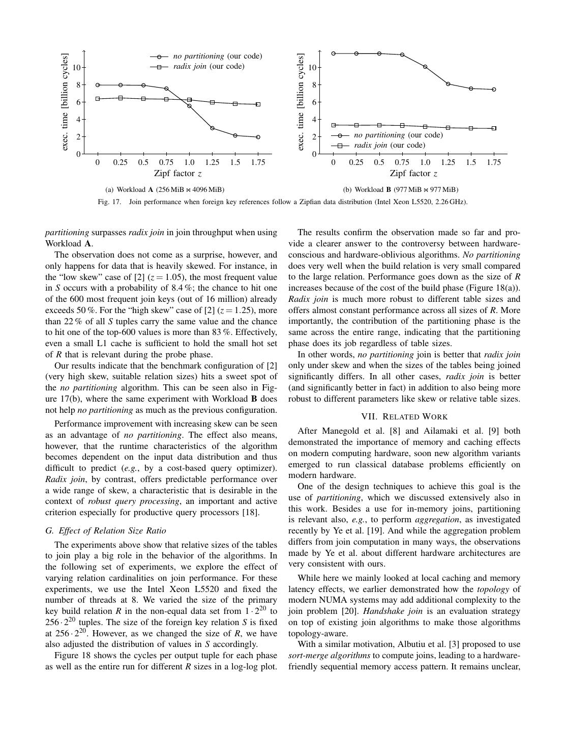 11 . exec. time [billion cycles] exec. time [billion cycles] no partitioning (our code) 10 radix join (our code) 10 8 8 6 6 4 4 2 2 no partitioning (our code) radix join (our code) 0 0 0 0.25 0.5 0.75 1.0 1.25 1.5 1.75 0 0.25 0.5 0.75 1.0 1.25 1.5 1.75 Zipf factor z Zipf factor z (a) Workload A (256 MiB 4096 MiB) (b) Workload B (977 MiB 977 MiB) Fig. 17. Join performance when foreign key references follow a Zipfian data distribution (Intel Xeon L5520, 2.26 GHz). partitioning surpasses radix join in join throughput when using The results confirm the observation made so far and pro- Workload A. vide a clearer answer to the controversy between hardware- The observation does not come as a surprise, however, and conscious and hardware-oblivious algorithms. No partitioning only happens for data that is heavily skewed. For instance, in does very well when the build relation is very small compared the “low skew” case of [2] (z = 1.05), the most frequent value to the large relation. Performance goes down as the size of R in S occurs with a probability of 8.4 %; the chance to hit one increases because of the cost of the build phase (Figure 18(a)). of the 600 most frequent join keys (out of 16 million) already Radix join is much more robust to different table sizes and exceeds 50 %. For the “high skew” case of [2] (z = 1.25), more offers almost constant performance across all sizes of R. More than 22 % of all S tuples carry the same value and the chance importantly, the contribution of the partitioning phase is the to hit one of the top-600 values is more than 83 %. Effectively, same across the entire range, indicating that the partitioning even a small L1 cache is sufficient to hold the small hot set phase does its job regardless of table sizes. of R that is relevant during the probe phase. In other words, no partitioning join is better that radix join Our results indicate that the benchmark configuration of [2] only under skew and when the sizes of the tables being joined (very high skew, suitable relation sizes) hits a sweet spot of significantly differs. In all other cases, radix join is better the no partitioning algorithm. This can be seen also in Fig- (and significantly better in fact) in addition to also being more ure 17(b), where the same experiment with Workload B does robust to different parameters like skew or relative table sizes. not help no partitioning as much as the previous configuration. VII. R ELATED W ORK Performance improvement with increasing skew can be seen as an advantage of no partitioning. The effect also means, After Manegold et al. [8] and Ailamaki et al. [9] both however, that the runtime characteristics of the algorithm demonstrated the importance of memory and caching effects becomes dependent on the input data distribution and thus on modern computing hardware, soon new algorithm variants difficult to predict (e.g., by a cost-based query optimizer). emerged to run classical database problems efficiently on Radix join, by contrast, offers predictable performance over modern hardware. a wide range of skew, a characteristic that is desirable in the One of the design techniques to achieve this goal is the context of robust query processing, an important and active use of partitioning, which we discussed extensively also in criterion especially for productive query processors [18]. this work. Besides a use for in-memory joins, partitioning is relevant also, e.g., to perform aggregation, as investigated G. Effect of Relation Size Ratio recently by Ye et al. [19]. And while the aggregation problem The experiments above show that relative sizes of the tables differs from join computation in many ways, the observations to join play a big role in the behavior of the algorithms. In made by Ye et al. about different hardware architectures are the following set of experiments, we explore the effect of very consistent with ours. varying relation cardinalities on join performance. For these While here we mainly looked at local caching and memory experiments, we use the Intel Xeon L5520 and fixed the latency effects, we earlier demonstrated how the topology of number of threads at 8. We varied the size of the primary modern NUMA systems may add additional complexity to the key build relation R in the non-equal data set from 1 · 220 to join problem [20]. Handshake join is an evaluation strategy 256 · 220 tuples. The size of the foreign key relation S is fixed on top of existing join algorithms to make those algorithms at 256 · 220 . However, as we changed the size of R, we have topology-aware. also adjusted the distribution of values in S accordingly. With a similar motivation, Albutiu et al. [3] proposed to use Figure 18 shows the cycles per output tuple for each phase sort-merge algorithms to compute joins, leading to a hardware- as well as the entire run for different R sizes in a log-log plot. friendly sequential memory access pattern. It remains unclear,