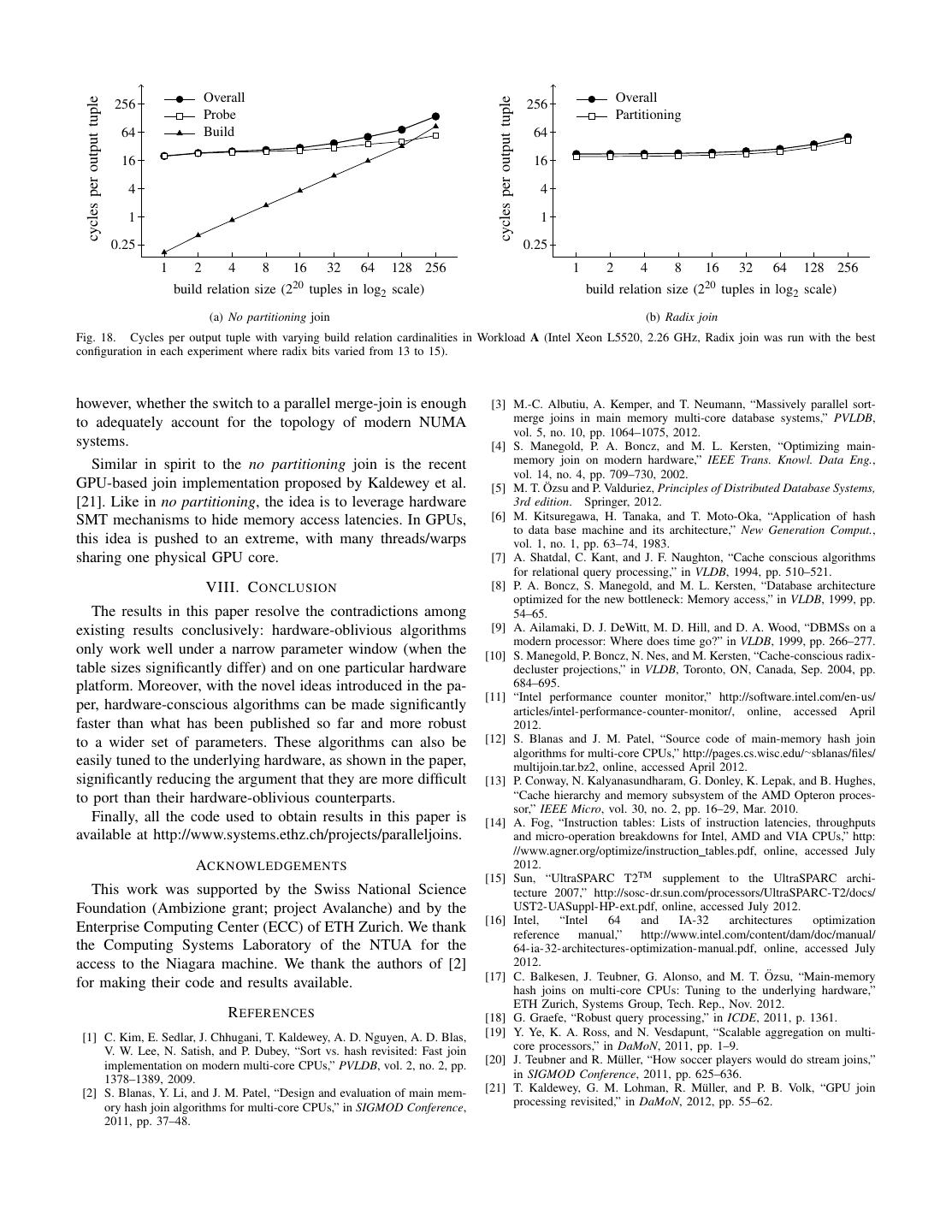 12 . cycles per output tuple Overall Overall cycles per output tuple 256 256 Probe Partitioning 64 Build 64 16 16 4 4 1 1 0.25 0.25 1 2 4 8 16 32 64 128 256 1 2 4 8 16 32 64 128 256 build relation size (220 tuples in log2 scale) build relation size (220 tuples in log2 scale) (a) No partitioning join (b) Radix join Fig. 18. Cycles per output tuple with varying build relation cardinalities in Workload A (Intel Xeon L5520, 2.26 GHz, Radix join was run with the best configuration in each experiment where radix bits varied from 13 to 15). however, whether the switch to a parallel merge-join is enough [3] M.-C. Albutiu, A. Kemper, and T. Neumann, “Massively parallel sort- to adequately account for the topology of modern NUMA merge joins in main memory multi-core database systems,” PVLDB, vol. 5, no. 10, pp. 1064–1075, 2012. systems. [4] S. Manegold, P. A. Boncz, and M. L. Kersten, “Optimizing main- Similar in spirit to the no partitioning join is the recent memory join on modern hardware,” IEEE Trans. Knowl. Data Eng., vol. 14, no. 4, pp. 709–730, 2002. GPU-based join implementation proposed by Kaldewey et al. ¨ [5] M. T. Ozsu and P. Valduriez, Principles of Distributed Database Systems, [21]. Like in no partitioning, the idea is to leverage hardware 3rd edition. Springer, 2012. SMT mechanisms to hide memory access latencies. In GPUs, [6] M. Kitsuregawa, H. Tanaka, and T. Moto-Oka, “Application of hash to data base machine and its architecture,” New Generation Comput., this idea is pushed to an extreme, with many threads/warps vol. 1, no. 1, pp. 63–74, 1983. sharing one physical GPU core. [7] A. Shatdal, C. Kant, and J. F. Naughton, “Cache conscious algorithms for relational query processing,” in VLDB, 1994, pp. 510–521. VIII. C ONCLUSION [8] P. A. Boncz, S. Manegold, and M. L. Kersten, “Database architecture optimized for the new bottleneck: Memory access,” in VLDB, 1999, pp. The results in this paper resolve the contradictions among 54–65. existing results conclusively: hardware-oblivious algorithms [9] A. Ailamaki, D. J. DeWitt, M. D. Hill, and D. A. Wood, “DBMSs on a modern processor: Where does time go?” in VLDB, 1999, pp. 266–277. only work well under a narrow parameter window (when the [10] S. Manegold, P. Boncz, N. Nes, and M. Kersten, “Cache-conscious radix- table sizes significantly differ) and on one particular hardware decluster projections,” in VLDB, Toronto, ON, Canada, Sep. 2004, pp. platform. Moreover, with the novel ideas introduced in the pa- 684–695. [11] “Intel performance counter monitor,” http://software.intel.com/en-us/ per, hardware-conscious algorithms can be made significantly articles/intel-performance-counter-monitor/, online, accessed April faster than what has been published so far and more robust 2012. to a wider set of parameters. These algorithms can also be [12] S. Blanas and J. M. Patel, “Source code of main-memory hash join algorithms for multi-core CPUs,” http://pages.cs.wisc.edu/∼sblanas/files/ easily tuned to the underlying hardware, as shown in the paper, multijoin.tar.bz2, online, accessed April 2012. significantly reducing the argument that they are more difficult [13] P. Conway, N. Kalyanasundharam, G. Donley, K. Lepak, and B. Hughes, to port than their hardware-oblivious counterparts. “Cache hierarchy and memory subsystem of the AMD Opteron proces- sor,” IEEE Micro, vol. 30, no. 2, pp. 16–29, Mar. 2010. Finally, all the code used to obtain results in this paper is [14] A. Fog, “Instruction tables: Lists of instruction latencies, throughputs available at http://www.systems.ethz.ch/projects/paralleljoins. and micro-operation breakdowns for Intel, AMD and VIA CPUs,” http: //www.agner.org/optimize/instruction tables.pdf, online, accessed July ACKNOWLEDGEMENTS 2012. [15] Sun, “UltraSPARC T2TM supplement to the UltraSPARC archi- This work was supported by the Swiss National Science tecture 2007,” http://sosc-dr.sun.com/processors/UltraSPARC-T2/docs/ Foundation (Ambizione grant; project Avalanche) and by the UST2-UASuppl-HP-ext.pdf, online, accessed July 2012. [16] Intel, “Intel 64 and IA-32 architectures optimization Enterprise Computing Center (ECC) of ETH Zurich. We thank reference manual,” http://www.intel.com/content/dam/doc/manual/ the Computing Systems Laboratory of the NTUA for the 64-ia-32-architectures-optimization-manual.pdf, online, accessed July access to the Niagara machine. We thank the authors of [2] 2012. [17] C. Balkesen, J. Teubner, G. Alonso, and M. T. Ozsu, ¨ “Main-memory for making their code and results available. hash joins on multi-core CPUs: Tuning to the underlying hardware,” ETH Zurich, Systems Group, Tech. Rep., Nov. 2012. R EFERENCES [18] G. Graefe, “Robust query processing,” in ICDE, 2011, p. 1361. [1] C. Kim, E. Sedlar, J. Chhugani, T. Kaldewey, A. D. Nguyen, A. D. Blas, [19] Y. Ye, K. A. Ross, and N. Vesdapunt, “Scalable aggregation on multi- V. W. Lee, N. Satish, and P. Dubey, “Sort vs. hash revisited: Fast join core processors,” in DaMoN, 2011, pp. 1–9. implementation on modern multi-core CPUs,” PVLDB, vol. 2, no. 2, pp. [20] J. Teubner and R. M¨uller, “How soccer players would do stream joins,” 1378–1389, 2009. in SIGMOD Conference, 2011, pp. 625–636. [2] S. Blanas, Y. Li, and J. M. Patel, “Design and evaluation of main mem- [21] T. Kaldewey, G. M. Lohman, R. M¨uller, and P. B. Volk, “GPU join ory hash join algorithms for multi-core CPUs,” in SIGMOD Conference, processing revisited,” in DaMoN, 2012, pp. 55–62. 2011, pp. 37–48.