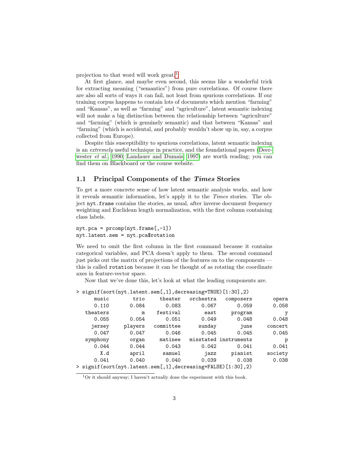 3 .projection to that word will work great.1 At first glance, and maybe even second, this seems like a wonderful trick for extracting meaning (“semantics”) from pure correlations. Of course there are also all sorts of ways it can fail, not least from spurious correlations. If our training corpus happens to contain lots of documents which mention “farming” and “Kansas”, as well as “farming” and “agriculture”, latent semantic indexing will not make a big distinction between the relationship between “agriculture” and “farming” (which is genuinely semantic) and that between “Kansas” and “farming” (which is accidental, and probably wouldn’t show up in, say, a corpus collected from Europe). Despite this susceptibility to spurious correlations, latent semantic indexing is an extremely useful technique in practice, and the foundational papers (Deer- wester et al., 1990; Landauer and Dumais, 1997) are worth reading; you can find them on Blackboard or the course website. 1.1 Principal Components of the Times Stories To get a more concrete sense of how latent semantic analysis works, and how it reveals semantic information, let’s apply it to the Times stories. The ob- ject nyt.frame contains the stories, as usual, after inverse document frequency weighting and Euclidean length normalization, with the first column containing class labels. nyt.pca = prcomp(nyt.frame[,-1]) nyt.latent.sem = nyt.pca$rotation We need to omit the first column in the first command because it contains categorical variables, and PCA doesn’t apply to them. The second command just picks out the matrix of projections of the features on to the components — this is called rotation because it can be thought of as rotating the coordinate axes in feature-vector space. Now that we’ve done this, let’s look at what the leading components are. > signif(sort(nyt.latent.sem[,1],decreasing=TRUE)[1:30],2) music trio theater orchestra composers opera 0.110 0.084 0.083 0.067 0.059 0.058 theaters m festival east program y 0.055 0.054 0.051 0.049 0.048 0.048 jersey players committee sunday june concert 0.047 0.047 0.046 0.045 0.045 0.045 symphony organ matinee misstated instruments p 0.044 0.044 0.043 0.042 0.041 0.041 X.d april samuel jazz pianist society 0.041 0.040 0.040 0.039 0.038 0.038 > signif(sort(nyt.latent.sem[,1],decreasing=FALSE)[1:30],2) 1 Or it should anyway; I haven’t actually done the experiment with this book. 3