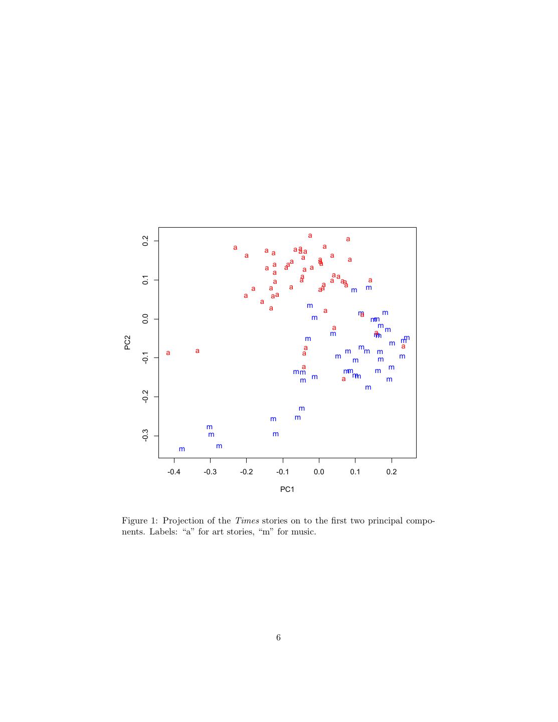 6 . a a 0.2 a a a aa a aa a a a a a aa a a a a a a a a a aa 0.1 a a a aa a a a a a a aa m m a aa a a m a m m m a 0.0 mm a m m am m m m m PC2 m m a a a m a a m m m -0.1 m m m m a m m mm mm m m a mm m m -0.2 m m m m -0.3 m m m m -0.4 -0.3 -0.2 -0.1 0.0 0.1 0.2 PC1 Figure 1: Projection of the Times stories on to the first two principal compo- nents. Labels: “a” for art stories, “m” for music. 6