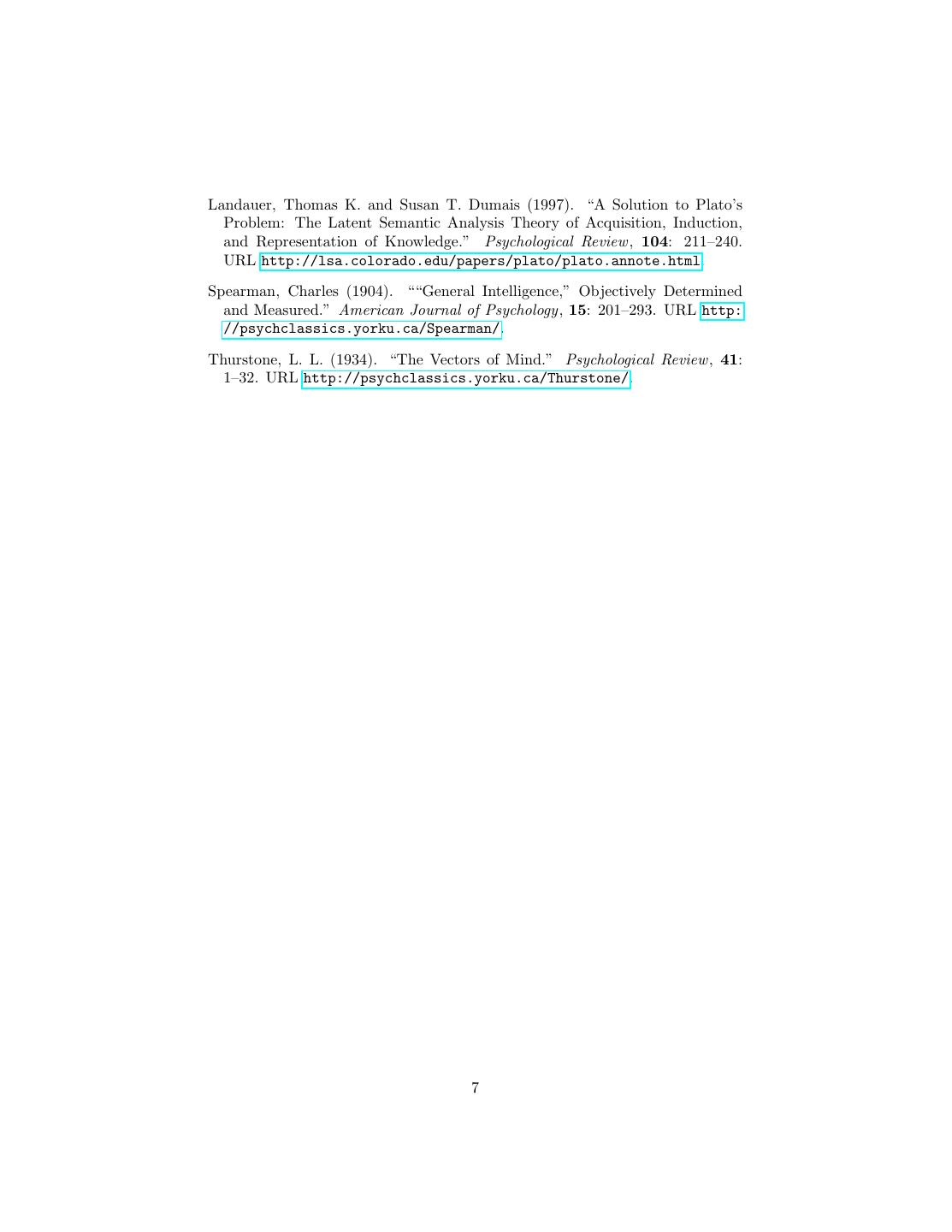 7 .Landauer, Thomas K. and Susan T. Dumais (1997). “A Solution to Plato’s Problem: The Latent Semantic Analysis Theory of Acquisition, Induction, and Representation of Knowledge.” Psychological Review , 104: 211–240. URL http://lsa.colorado.edu/papers/plato/plato.annote.html. Spearman, Charles (1904). ““General Intelligence,” Objectively Determined and Measured.” American Journal of Psychology, 15: 201–293. URL http: //psychclassics.yorku.ca/Spearman/. Thurstone, L. L. (1934). “The Vectors of Mind.” Psychological Review , 41: 1–32. URL http://psychclassics.yorku.ca/Thurstone/. 7