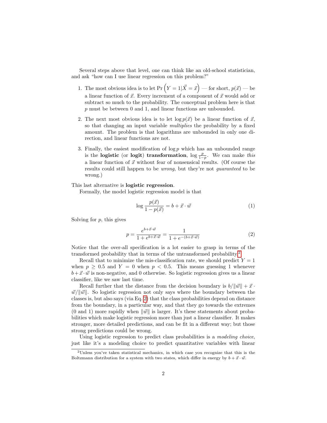 2 . Several steps above that level, one can think like an old-school statistician, and ask “how can I use linear regression on this problem?” 1. The most obvious idea is to let Pr Y = 1|X = x — for short, p(x) — be a linear function of x. Every increment of a component of x would add or subtract so much to the probability. The conceptual problem here is that p must be between 0 and 1, and linear functions are unbounded. 2. The next most obvious idea is to let log p(x) be a linear function of x, so that changing an input variable multiplies the probability by a fixed amount. The problem is that logarithms are unbounded in only one di- rection, and linear functions are not. 3. Finally, the easiest modification of log p which has an unbounded range p is the logistic (or logit) transformation, log 1−p . We can make this a linear function of x without fear of nonsensical results. (Of course the results could still happen to be wrong, but they’re not guaranteed to be wrong.) This last alternative is logistic regression. Formally, the model logistic regression model is that p(x) log =b+x·w (1) 1 − p(x) Solving for p, this gives eb+x·w 1 p= b+x·w = −(b+x·w) (2) 1+e 1+e Notice that the over-all specification is a lot easier to grasp in terms of the transformed probability that in terms of the untransformed probability.2 Recall that to minimize the mis-classification rate, we should predict Y = 1 when p ≥ 0.5 and Y = 0 when p < 0.5. This means guessing 1 whenever b + x · w is non-negative, and 0 otherwise. So logistic regression gives us a linear classifier, like we saw last time. Recall further that the distance from the decision boundary is b/ w + x · w/ w . So logistic regression not only says where the boundary between the classes is, but also says (via Eq. 2) that the class probabilities depend on distance from the boundary, in a particular way, and that they go towards the extremes (0 and 1) more rapidly when w is larger. It’s these statements about proba- bilities which make logistic regression more than just a linear classifier. It makes stronger, more detailed predictions, and can be fit in a different way; but those strong predictions could be wrong. Using logistic regression to predict class probabilities is a modeling choice, just like it’s a modeling choice to predict quantitative variables with linear 2 Unless you’ve taken statistical mechanics, in which case you recognize that this is the Boltzmann distribution for a system with two states, which differ in energy by b + x · w. 2