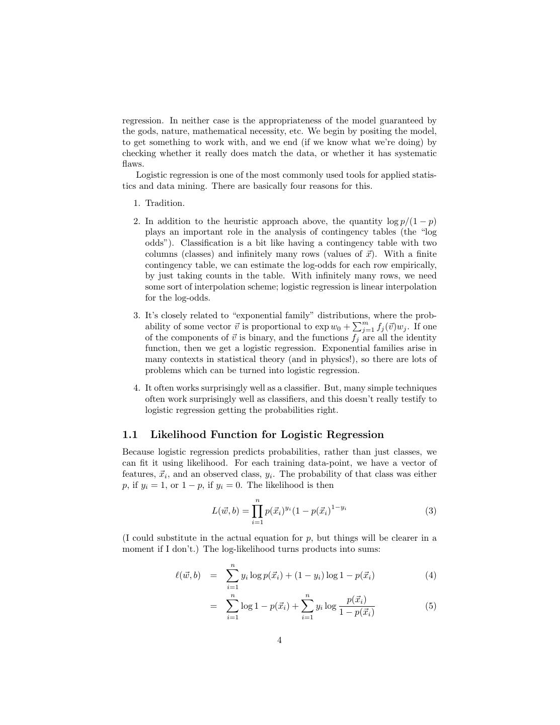 4 .regression. In neither case is the appropriateness of the model guaranteed by the gods, nature, mathematical necessity, etc. We begin by positing the model, to get something to work with, and we end (if we know what we’re doing) by checking whether it really does match the data, or whether it has systematic flaws. Logistic regression is one of the most commonly used tools for applied statis- tics and data mining. There are basically four reasons for this. 1. Tradition. 2. In addition to the heuristic approach above, the quantity log p/(1 − p) plays an important role in the analysis of contingency tables (the “log odds”). Classification is a bit like having a contingency table with two columns (classes) and infinitely many rows (values of x). With a finite contingency table, we can estimate the log-odds for each row empirically, by just taking counts in the table. With infinitely many rows, we need some sort of interpolation scheme; logistic regression is linear interpolation for the log-odds. 3. It’s closely related to “exponential family” distributions, where the prob- m ability of some vector v is proportional to exp w0 + j=1 fj (v)wj . If one of the components of v is binary, and the functions fj are all the identity function, then we get a logistic regression. Exponential families arise in many contexts in statistical theory (and in physics!), so there are lots of problems which can be turned into logistic regression. 4. It often works surprisingly well as a classifier. But, many simple techniques often work surprisingly well as classifiers, and this doesn’t really testify to logistic regression getting the probabilities right. 1.1 Likelihood Function for Logistic Regression Because logistic regression predicts probabilities, rather than just classes, we can fit it using likelihood. For each training data-point, we have a vector of features, xi , and an observed class, yi . The probability of that class was either p, if yi = 1, or 1 − p, if yi = 0. The likelihood is then n 1−yi L(w, b) = p(xi )yi (1 − p(xi ) (3) i=1 (I could substitute in the actual equation for p, but things will be clearer in a moment if I don’t.) The log-likelihood turns products into sums: n (w, b) = yi log p(xi ) + (1 − yi ) log 1 − p(xi ) (4) i=1 n n p(xi ) = log 1 − p(xi ) + yi log (5) i=1 i=1 1 − p(xi ) 4