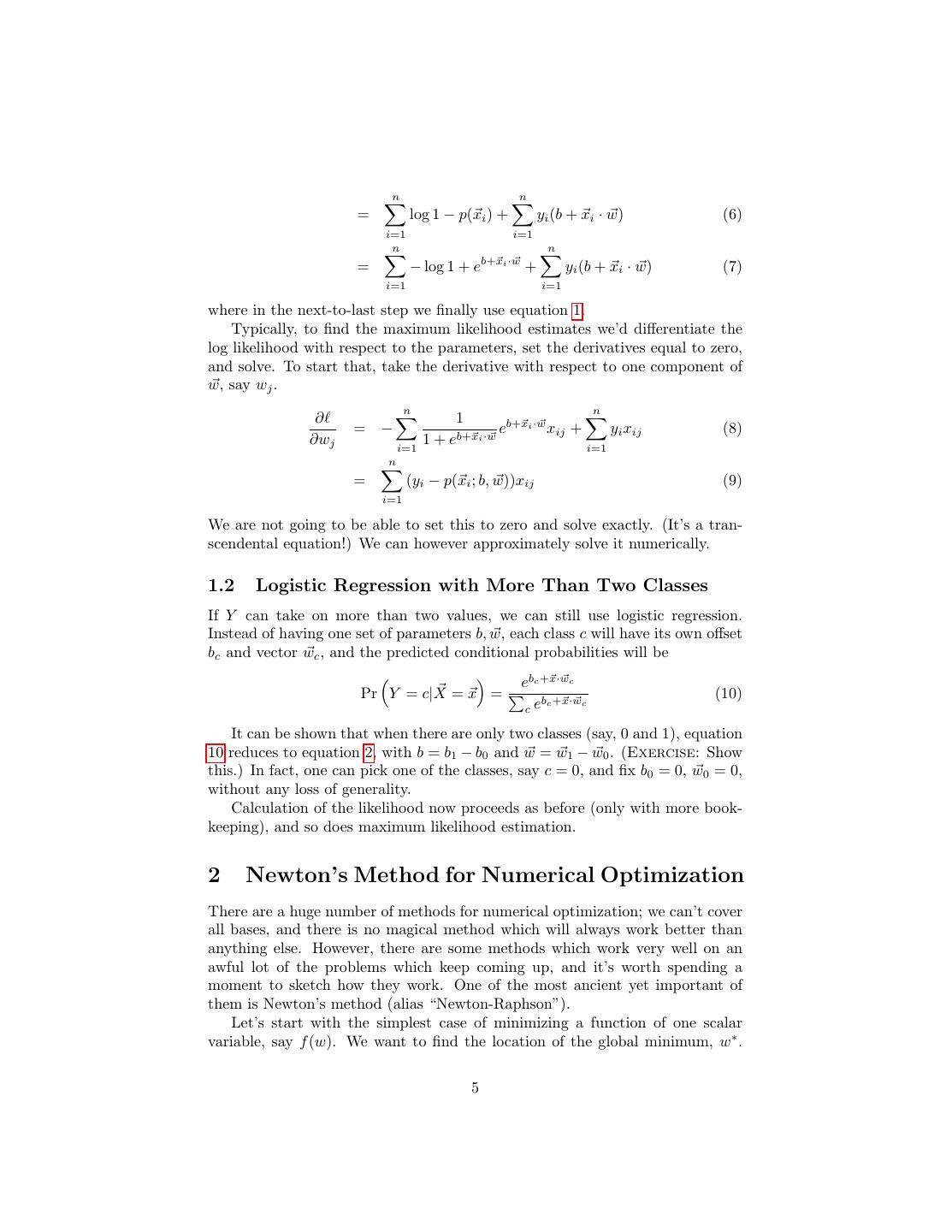 5 . n n = log 1 − p(xi ) + yi (b + xi · w) (6) i=1 i=1 n n = − log 1 + eb+xi ·w + yi (b + xi · w) (7) i=1 i=1 where in the next-to-last step we finally use equation 1. Typically, to find the maximum likelihood estimates we’d differentiate the log likelihood with respect to the parameters, set the derivatives equal to zero, and solve. To start that, take the derivative with respect to one component of w, say wj . n n ∂ 1 = − eb+xi ·w xij + yi xij (8) ∂wj i=1 1 + eb+xi ·w i=1 n = (yi − p(xi ; b, w))xij (9) i=1 We are not going to be able to set this to zero and solve exactly. (It’s a tran- scendental equation!) We can however approximately solve it numerically. 1.2 Logistic Regression with More Than Two Classes If Y can take on more than two values, we can still use logistic regression. Instead of having one set of parameters b, w, each class c will have its own offset bc and vector wc , and the predicted conditional probabilities will be ebc +x·wc Pr Y = c|X = x = bc +x·wc (10) ce It can be shown that when there are only two classes (say, 0 and 1), equation 10 reduces to equation 2, with b = b1 − b0 and w = w1 − w0 . (Exercise: Show this.) In fact, one can pick one of the classes, say c = 0, and fix b0 = 0, w0 = 0, without any loss of generality. Calculation of the likelihood now proceeds as before (only with more book- keeping), and so does maximum likelihood estimation. 2 Newton’s Method for Numerical Optimization There are a huge number of methods for numerical optimization; we can’t cover all bases, and there is no magical method which will always work better than anything else. However, there are some methods which work very well on an awful lot of the problems which keep coming up, and it’s worth spending a moment to sketch how they work. One of the most ancient yet important of them is Newton’s method (alias “Newton-Raphson”). Let’s start with the simplest case of minimizing a function of one scalar variable, say f (w). We want to find the location of the global minimum, w∗ . 5